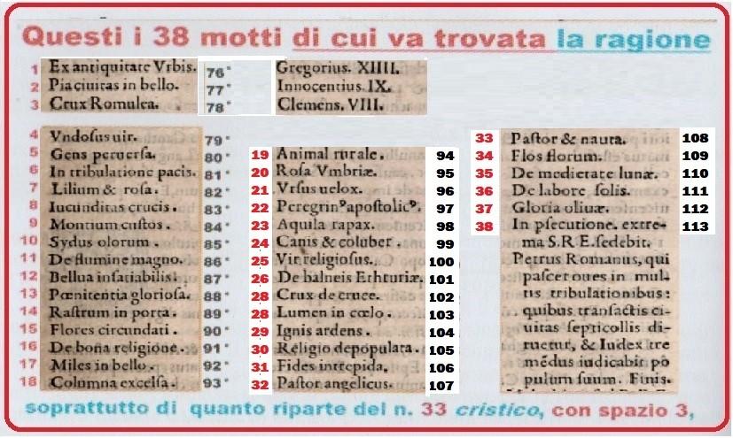 Infatti i motti sono, fino a quello che riguarda Pietro Romano, in numero di 112, mentre i soggetti riguardanti tutti i papi e tutti gli antipapi sono invece 113.