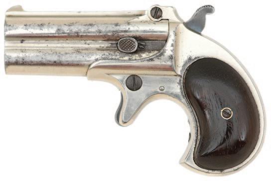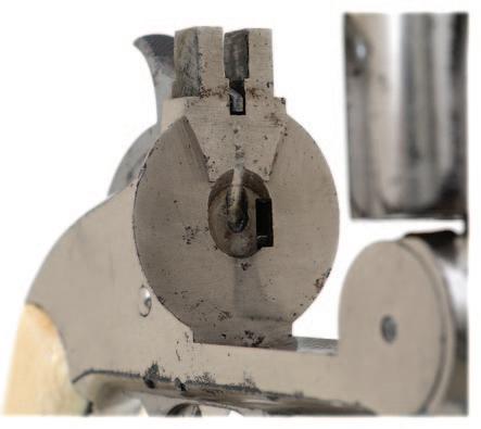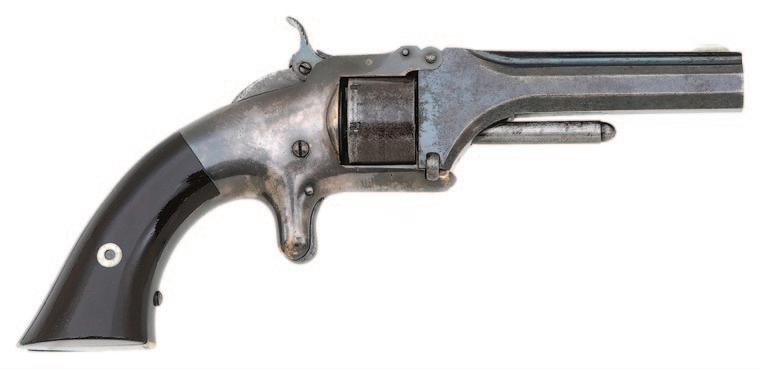 there is some finish loss which left some fine pitting behind. The cylinder shows typical light flaking but still shows perhaps 70% original blue. The revolver is equipped with its original smooth ivory or bone grips which rate excellent other than the common small crack at the top front edge of each panel. Mechanics are crisp. A fine and scarce variant of the Remington Smoot. (1B11886-1) {ANTIQUE} (1500/2500)