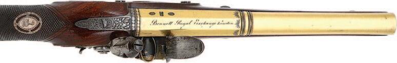subtle swamped muzzle. The stepped lockplate is flat with beveled edge and is very com pact. The lock features a sliding safety, swan neck cock, waterproof pan and a roller frizzen. The center of the lock is engraved "D. Egg" while the top of the barrel is in laid in gold "D. EGG LONDON". The breech is double gold banded with engraved tang and the touchhole is gold lined. The barrel is double key fastened, made without es cutcheons. The triggerguard is distinctly Egg with rounded front shank and angled rear with beautifully applied finger spur which guards an adjustable single set trigger. The triggerguard shows lovely engraving as does the rounded steel buttcap. The pistol has a simple washer around the single lock screw. The condition is very fine with the barre showing 95% original brown finish with strong damascus pattern its entire length. The lock and barrel tang show a very smooth and even gray patina blended with some original case hardening. The triggerguard and buttcap retain 90% plus bright original blue finish as does the tailpipe and ramrod thimble. The full length walnut stock has a beautifully checkered grip and the forend tip is of horn. The stock rates excellent with 95% original finish remaining exhibiting crisp edges and checkering. There is an oval gold monogram plate on the top of the wrist which is engraved with script initials "GL". The lock and set trigger function crisply. A very handsome and high condition pistol from this famed London maker. (1E11730-1122) {ANTIQUE} [Peter DeRose Collection] (5000/7000)