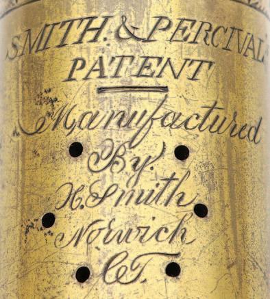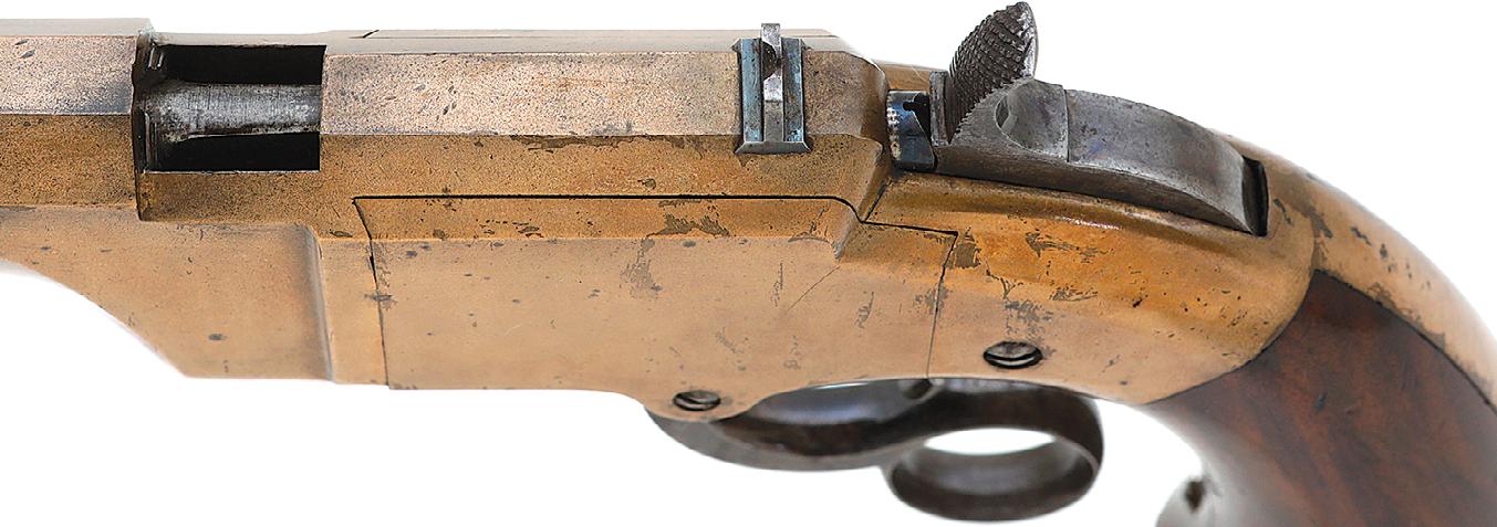 serial #94799, 22 RF, 3 3/16” octagon barrel with a fair bore showing moderate old oxidation and good rifling. This revolver is embellished with some very attractive period New York-style engraving featuring finely detailed foliate scrollwork with punch-dot background shading, crosshatched areas and the sides of the frame with a nice crosshatched diamond whose points terminate in nice scrollwork. The cylinder circumference alternates between a foliate flourish and large starburst. The barrel and frame retain about 90% period silver finish with some flaked areas toning to gray-brown along the sides of the barrel and the silver with a lovely untouched dark tarnish. The cylinder has mostly flaked to gray-brown patina showing a little pinprick pitting and the trigger and hammer retain what appears to be generous gold wash over the silver. The smooth