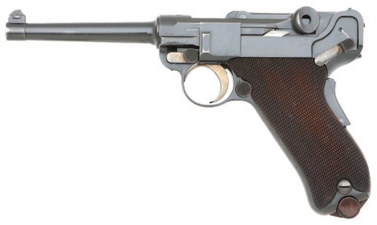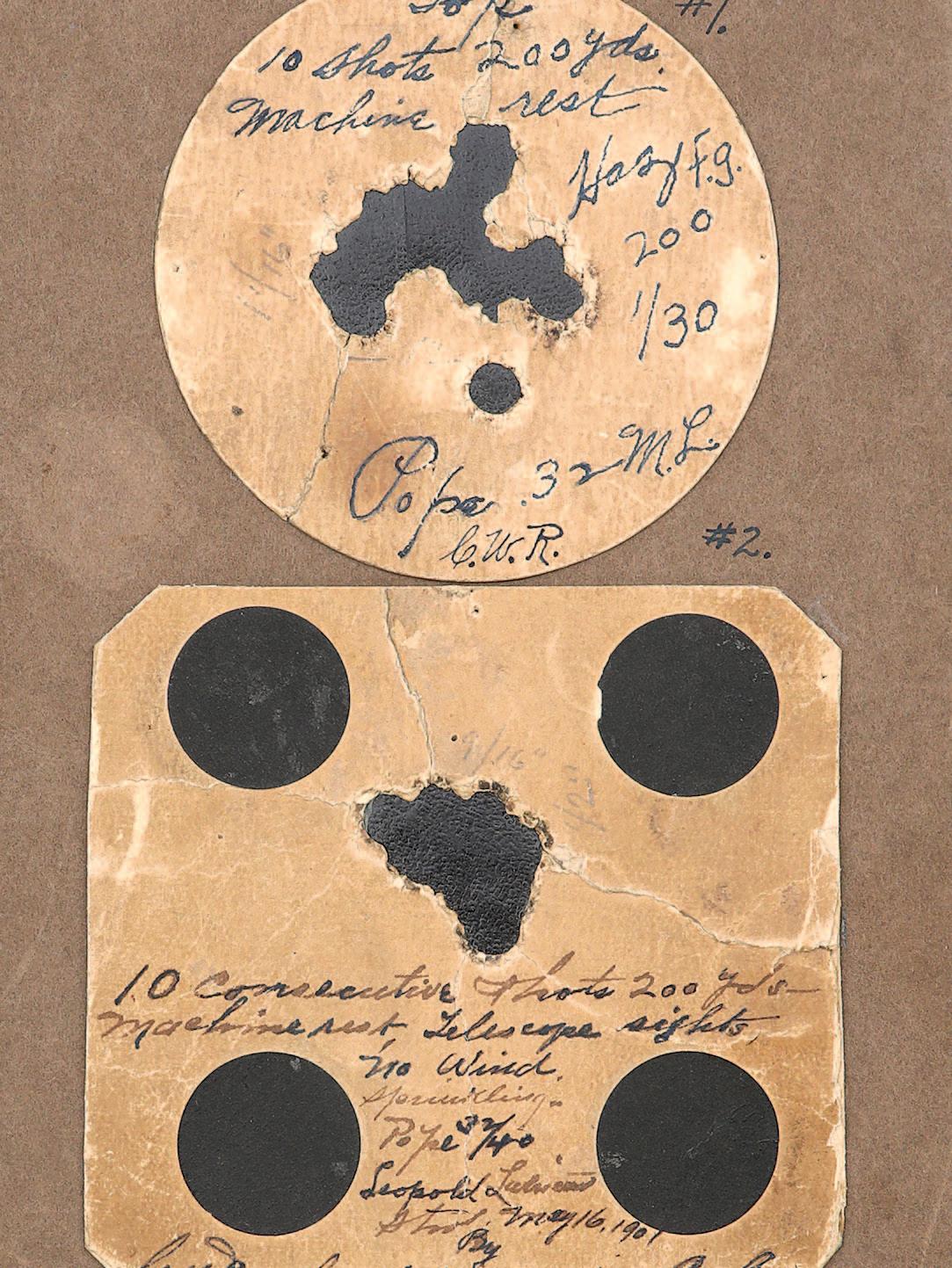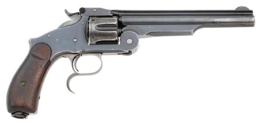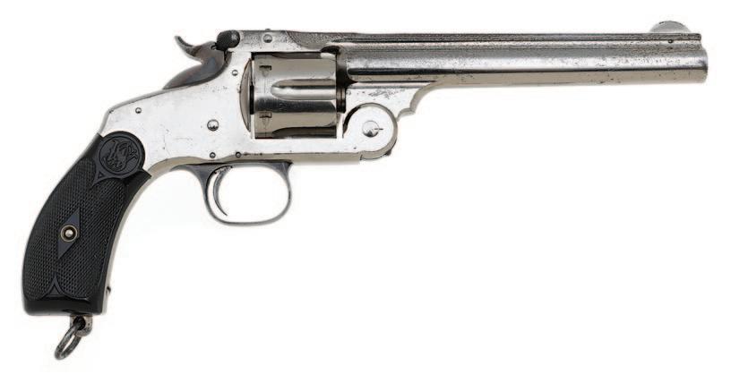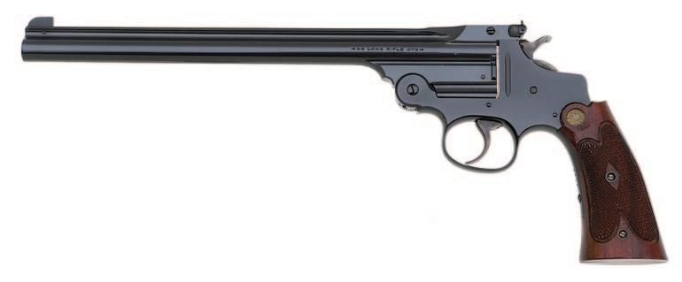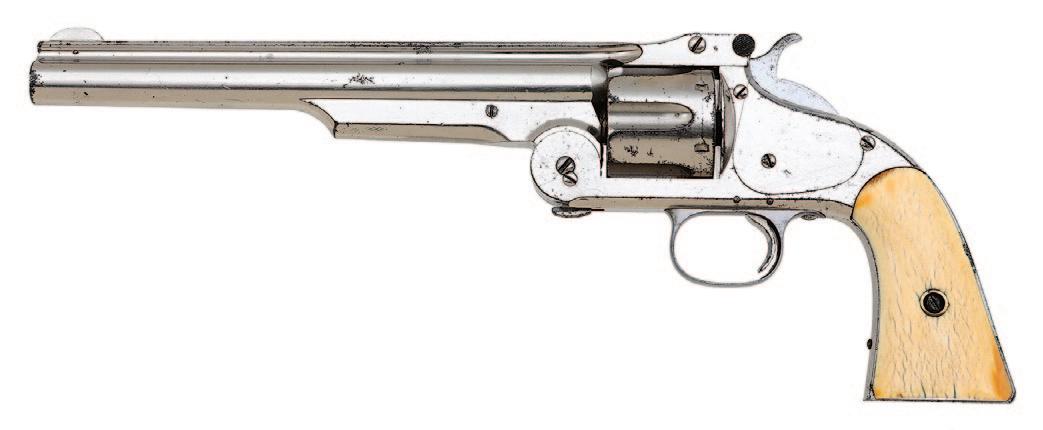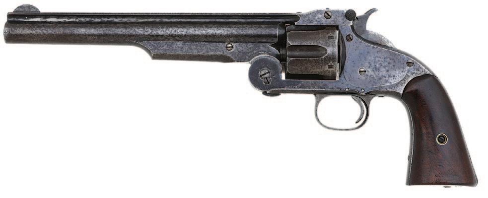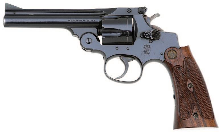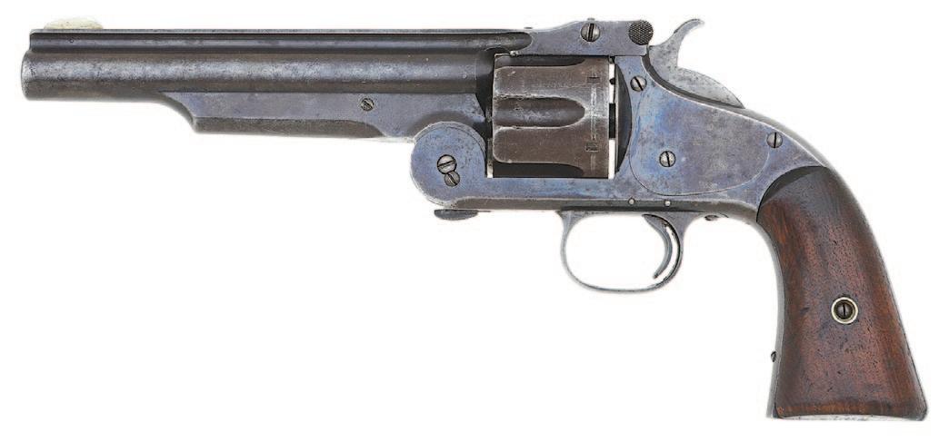 serial #13981, 22 LR, 10” barrels with bright excellent bores. This interesting pistol is a modified First Model, retaining the frame cutouts for the bolt and hand as-expected but the record shield was cut back to just a slight lip on either side, no doubt by Smith & Wesson themselves. The pistol wears a fine set of smooth antique ivory grips, the left neatly inscribed “Presented by Smith & Wesson / N.E.S.A. / 1898 / Won by E.E. Patridge”. American sportsman Eugene E. Patridge developed his eponymous wide square blade sight around this time and both of the barrels of this pistol are of course fitted with them. An article from 1899 details the June Massachusetts Rifle Association shoot at Walnut Hill during which Patridge scored a 97, 95 and 96 at the 50 yard pistol match using a “Smith & Wesson pistol which has a trigger pull of 2 1/2 pounds”, very possibly this gun itself! The currently installed barrel retains about 85% original bright blue showing some scattered flaking to gray-brown patina, a few tiny dings and oxidation speckles. The frame and spare barrel retain about 98% factory refurbished blue showing some light handling marks and the barrel with some remnants of light pitting under the finish for 2 1/2” back from the muzzle. The left inside frame shows factory rework date of August 1923 and the spare barrel also shows a factory rework mark. Both sets of barrels and latches are numbered to the frame. The hammer retains fine case-hardened colors, the triggerguard is a nice smoky patina and the trigger is finely checkered. The ivory grips are also in near excellent condition showing a few scattered areas of mild crackling with a mellow patina and nice striations overall. The presentation on the left side remains crisp and the included original leather-covered case with double latch catches remains in fine condition with some overall flaking along the exterior. The interior is lined in fine tan suede and French-fitted for just the revolver and a cleaning rod (not the spare barrel) and shows one small tear on the lid lining. This is a fine cased set owned by a well-known period American shooter whose sights are still used to this day. (13C11730-178) {ANTIQUE} [Peter DeRose Collection] (6000/8000)