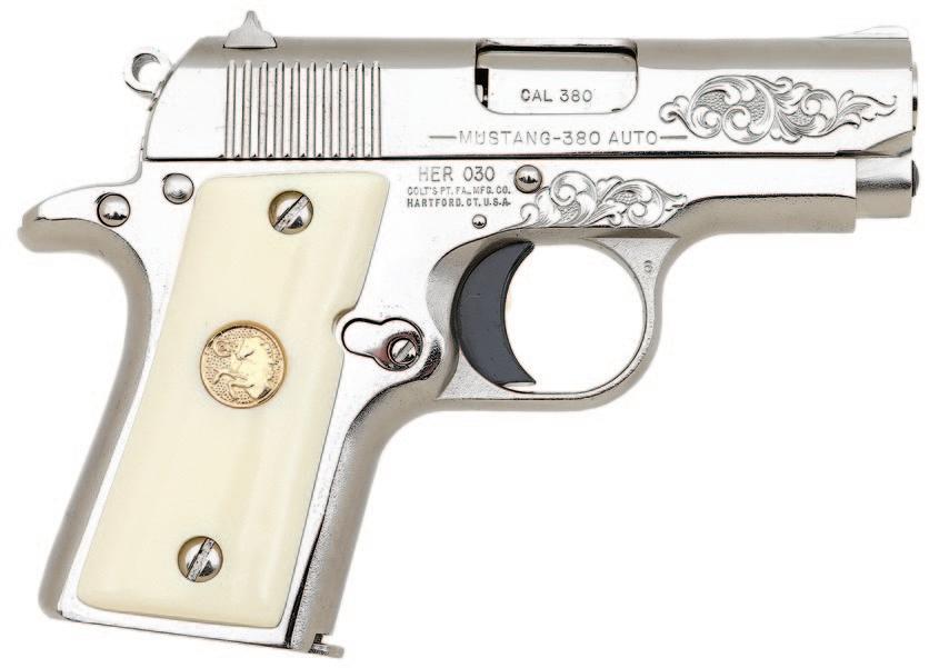 serial #837, 32 ACP, 3 1/2” barrel with a bright excellent bore. This interesting dual tone pistol was made for company president Harold Wesson in 1930 and remains in excellent condition retaining about 99% original bright nickel and blue finishes showing just some sparsely scattered light handling marks. The top of the slide and the slide serrations have been given a nice matted treatment and all markings remain strong, the backstrap neatly engraved with Mr. Wesson’s name. The pistol was fitted by the factory with smooth ivory grips that bear gold S&W medallions and scrimshawed initials “H.W.” on both. The grips rate excellent showing a mellow patina and nice grain and one original magazine is included. The included factory letter indicates the pistol was delivered as-described to Harold Wesson on March 21, 1930 and, as was standard company procedure for Wesson family arms, was built utilizing rejected parts. The pistol was assembled by service department foreman Charlie Call and the letter also notes that the company records instructed to not finish another one of this model in nickel again due to problems fitting the parts with the thicker nickel plating. This is a rare opportunity to own a unique 32 Automatic with a direct connection to the Wesson family and company leadership. (13E11730-873) {C&R} [Peter DeRose Collection] (7000/9000)
