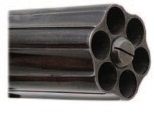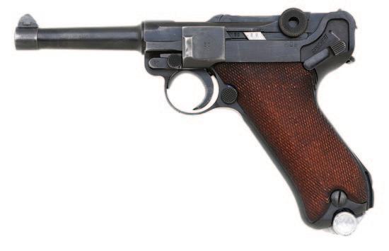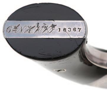serial #140 / 510, 455 Webley, 5 3/4” barrel with a partially bright very good bore showing some light pitting and oxi dation with otherwise strong rifling throughout. This is a scarce low-production First Pattern revolver characterized by its lack of the familiar lever on the left side of the gun to open the action which would appear on the Second Pattern and then, in slightly modified form, on all later Webley re volvers. This pattern simply has a push-button on the left side, pressed to unlock the latch and open the action. The revolver has been nicely restored, probably in England or Australia, retaining perhaps 90% fine quality bright blue with some overall flaking to a deep gray patina under bright light along with a few remnants of pinprick pits here and there.