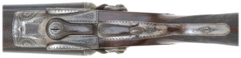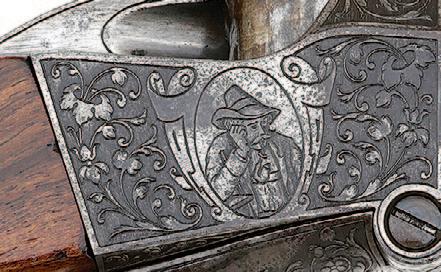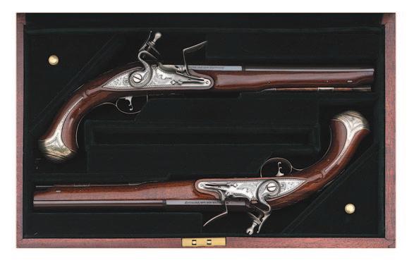 .41 caliber, 3" octagon barrels. These interesting and superbly crafted pistols were made in the early 1800's by the nephew of famed London maker Durs Egg. Because they are over under pistols the locks have no interior space to house the mainsprings so they feature external mainsprings that act as both the main and frizzen springs. The locks are very compact with sliding safeties, waterproof pans and roller frizzens. The locks are each engraved "JOSh EGG" and show very fine border engraving as well as some scroll on the beveled rear edge. The barrels are double gold banded with top barrel inlaid in gold "J. EGG * LONDON" and the bottom barrel being engraved "Piccadilly London". The buttcaps and triggerguards are of silver and are beautifully engraved in full coverage with slightly domed butts which are plain and act as monogram plates. The top of the slender wrist has a rectangular gold monogram plate which is unadorned. The condition of the pistol is very nice with the barrels retaining generous traces of original blue with the balance showing a pleasing smooth gray brown patina. All markings in metal remain clear and legible. The locks are a pleasing smooth gray brown patina with fine engraving on the cocks and frizzens. The silver triggerguard and buttcap show a nice tarnish with engraving remaining crisp and with a sunken "M" touchmark on the triggerguard. The walnut grip rates excellent showing a good deal of original finish with nice strong flat top checkering. A very fine example of these extremely fine and desirable "Baby Egg" pistols. (1D11730-1145) {ANTIQUE} [Peter DeRose Collection] (8,000/ 12,000)