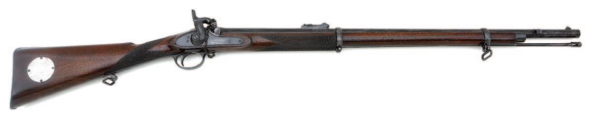 The hammer, trigger, and latch spring are polished bright while the screw heads show pale fire blue. The original markings are intact and strong showing Kaufmann number “140” on the right side of the frame and Webley number “510” on the inside flat of the barrel. The topstrap shows Australian retailer marking of W.E. Ekins in Adelaide. The checkered walnut grips are stamp-numbered to the gun and remain in very fine condition showing a little added finish and some lightly chipped points. Barrel-toframe fit exhibits a little minor play and the action seems to function well mechanically. The revolver includes an original British oak case in lovely condition showing some light dings along the exterior. The interior is lined in blue baize and is devoid of a retailer label and the case contains a brass cleaning rod with jag attachment, glass oil bottle, rosewood handled turnscrew and 30 cartridges in the block. Only a few hundred First Pattern revolvers were manufactured. (13B11874-134) {ANTIQUE} [Alan J. Gaines Collection] (3000/5000)