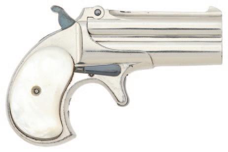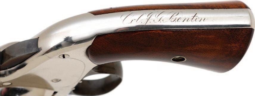 appears to have been gold-washed over silver. The cylinder shows an old cleaning and is mostly pewter gunmetal with some remnants of silver and light pitting. The hammer has also been polished bright and all markings and the engraving remain crisp. The smooth mother-of-pearl grips remain in near excellent condition showing a few light handling marks and a little subtle discoloration along the edges, the in teriors of both scratched with a “III”. The barrel and cylinder match the frame by assembly number, barrel-to-frame fit is solid and the action seems to function normally. The revolver includes a very nice period green leather-covered pipe case that shows some light flaking and edge wear along the exterior. The interior is lined in purple silk along the lid and blue velvet along the base showing some slightly faded areas. (13B11730-60) {ANTIQUE} [Peter DeRose Collection] (2000/3000)