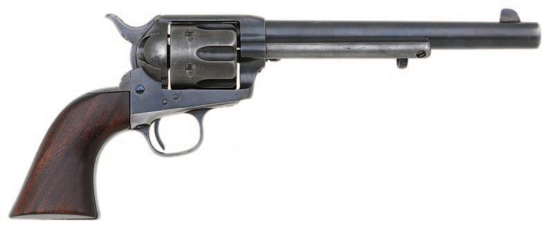 equipped with a lovely pair of period smooth ivory grips which show a wonderful yellow age patina with just a couple age cracks visible in the butt. The grips fit nicely and appear to have been on this revolver since day one. The revolver comes in a nice lightly hand tooled leather California style Slim Jim holster which rates very good. The holster shows some light crazing but surfaces are generally very good and all the stitching remains intact. This is a very attractive set which has a great Southwestern frontier look and feel. (1C11874-79) {ANTIQUE} [Alan J. Gaines Collection] (6000/8000)