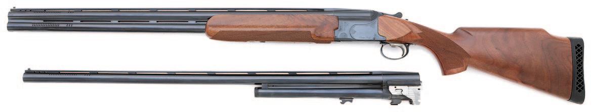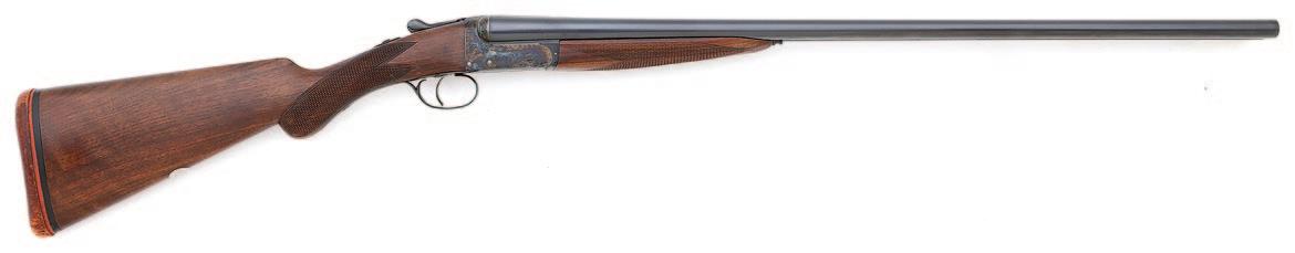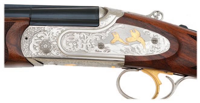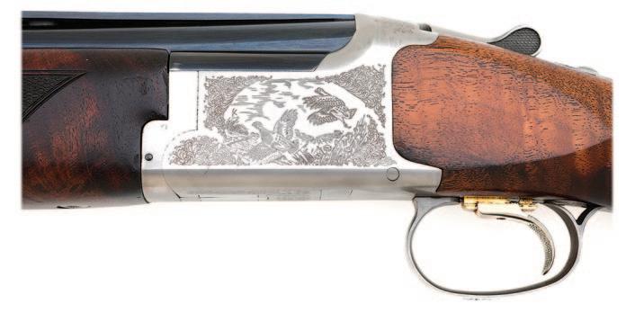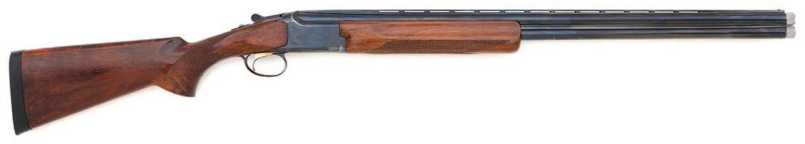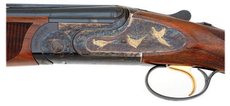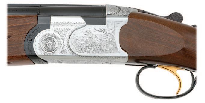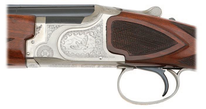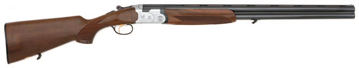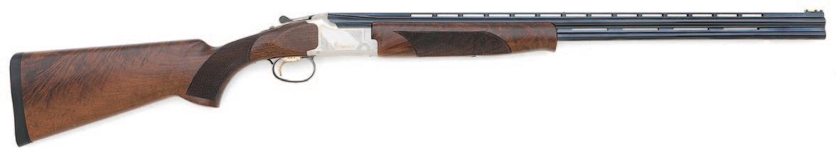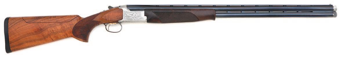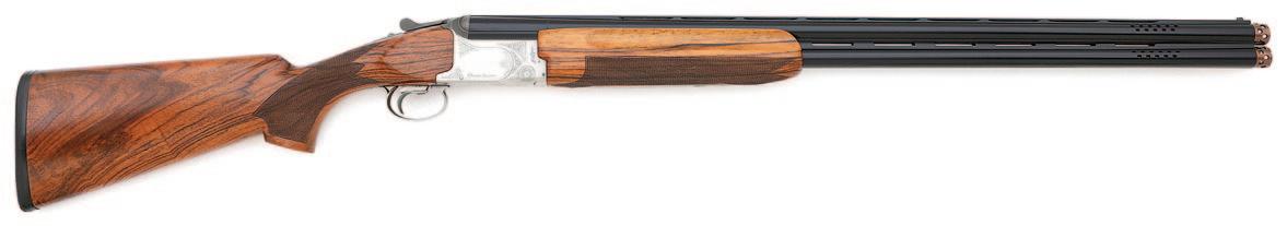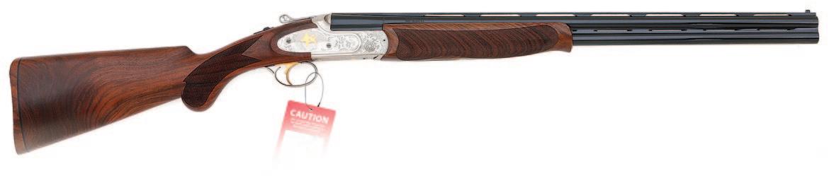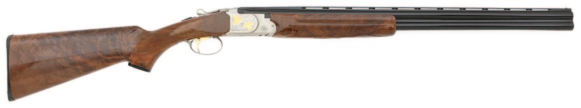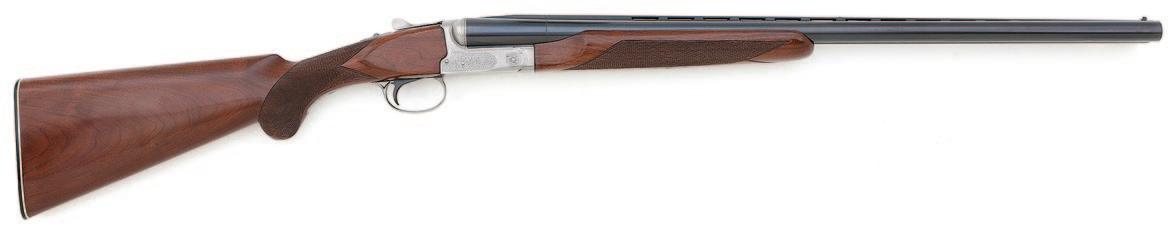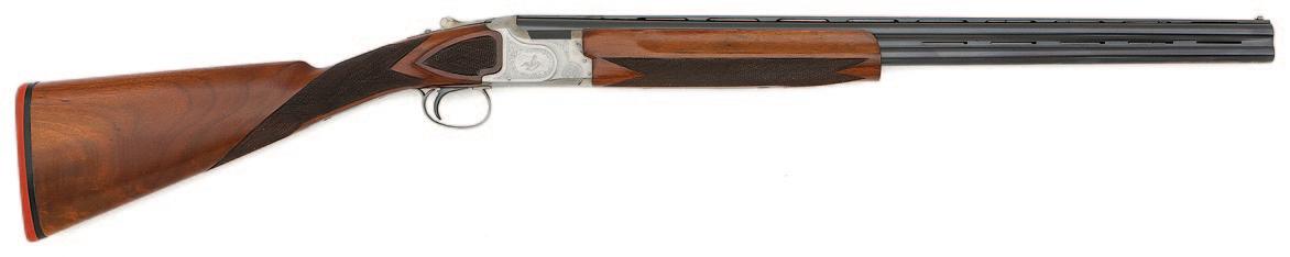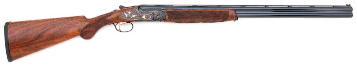 engraving, a floral motif on the hinge pin, and games scenes of grouse left and quail right; the trigger retains all of its gold finish. The capped pistolgrip deluxe walnut stock and forend are in excellent condition with perhaps a light handling mark or two, and feature a 14 1/2” length of pull to the factory grooved black plastic buttplate and lovely grain figure throughout. The shotgun locks up tight and on-face via Greener-style crossbolt with the lever coming to rest just right of center and features a single selective inertial trigger, nonautomatic safety, ejectors, and is sighted with a lone brass bead. Included is the factory box, end labeled and numbered to the gun, and two screw-chokes marked modified and improved cylinder. An attractive smallbore shotgun. (14B12028-2) {MODERN} (1000/1500)