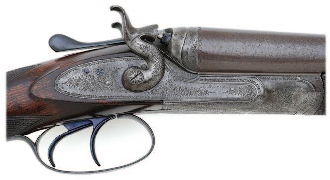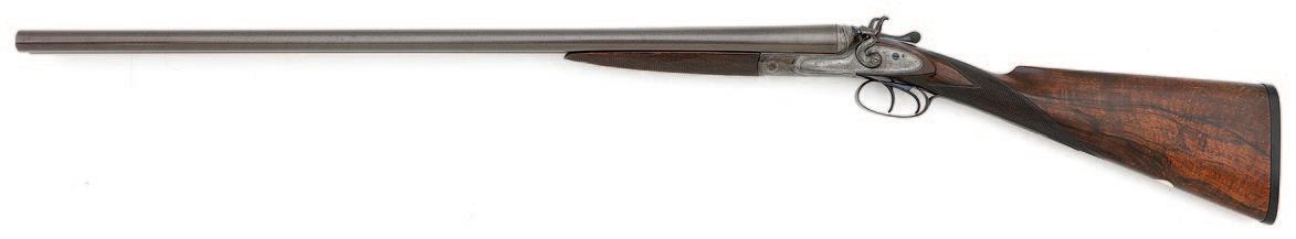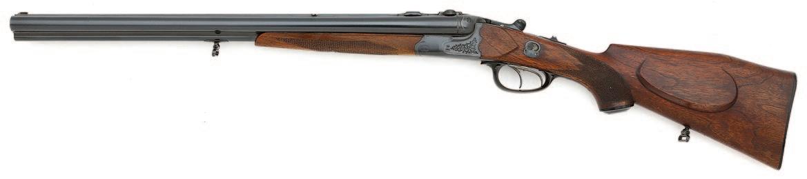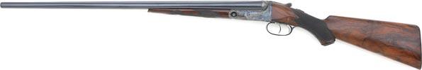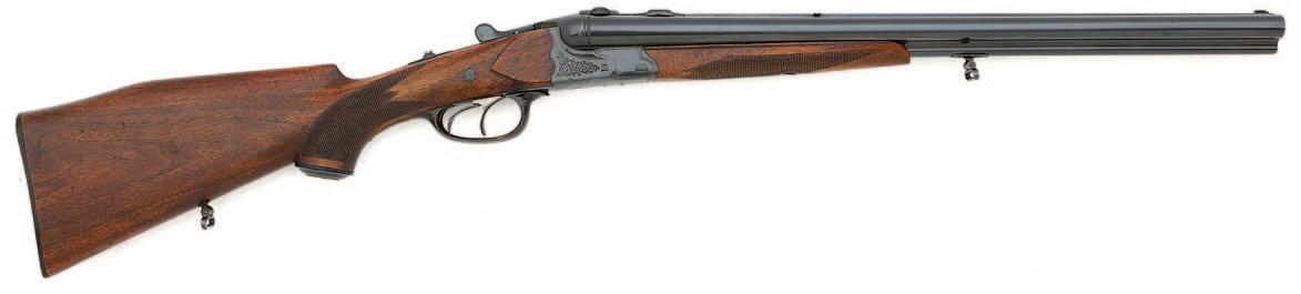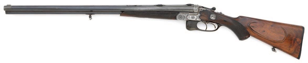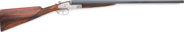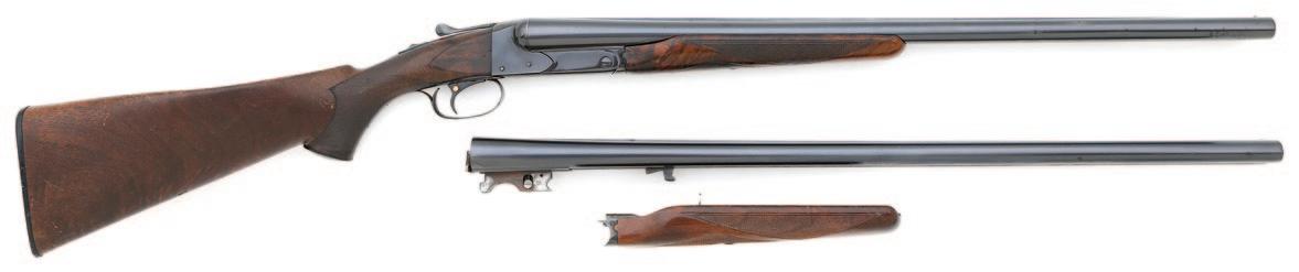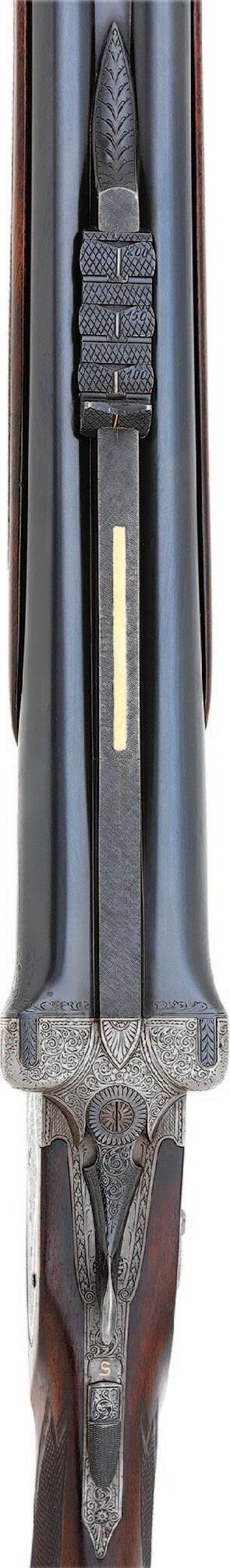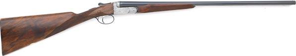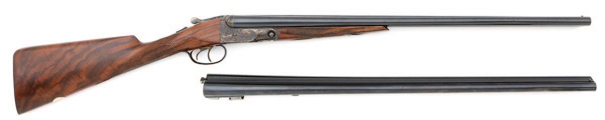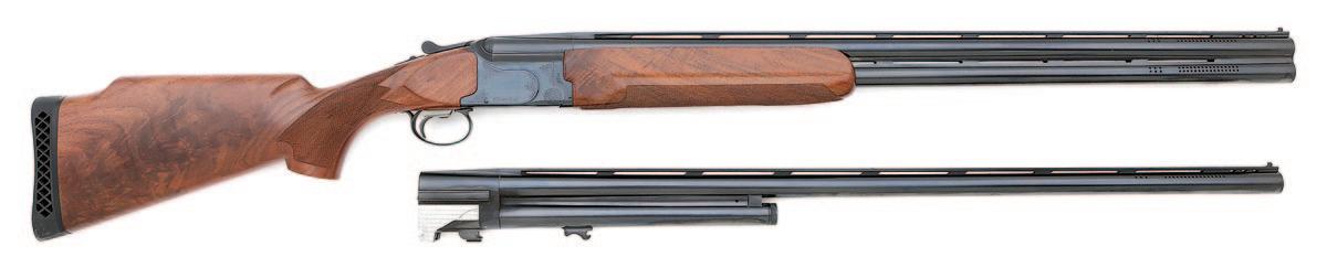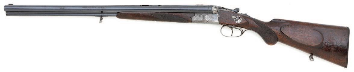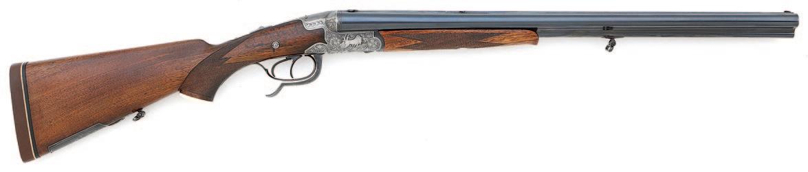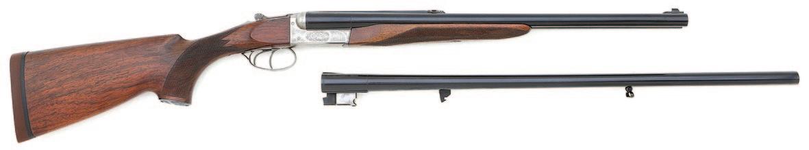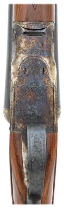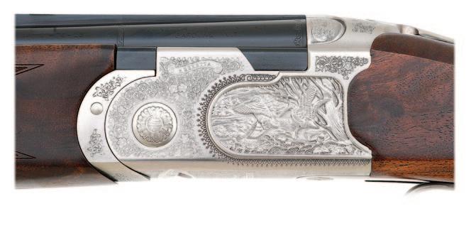 engraving, a floral motif on the hinge pin, and games scenes of grouse left and quail right; the trigger retains all of its gold finish. The capped pistolgrip deluxe walnut stock and forend are in excellent condition with perhaps a light handling mark or two, and feature a 14 1/2” length of pull to the factory grooved black plastic buttplate and lovely grain figure throughout. The shotgun locks up tight and on-face via Greener-style crossbolt with the lever coming to rest just right of center and features a single selective inertial trigger, nonautomatic safety, ejectors, and is sighted with a lone brass bead. Included is the factory box, end labeled and numbered to the gun, and two screw-chokes marked modified and improved cylinder. An attractive smallbore shotgun. (14B12028-2) {MODERN} (1000/1500)
