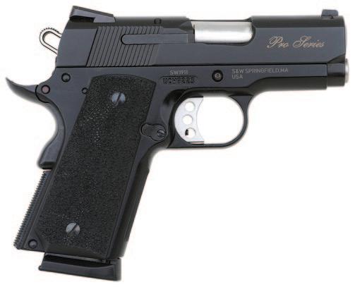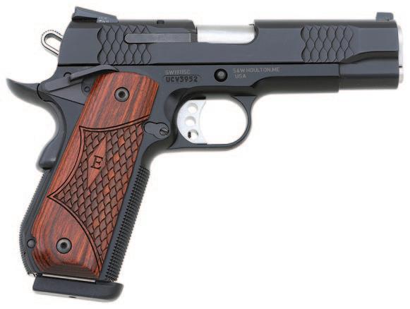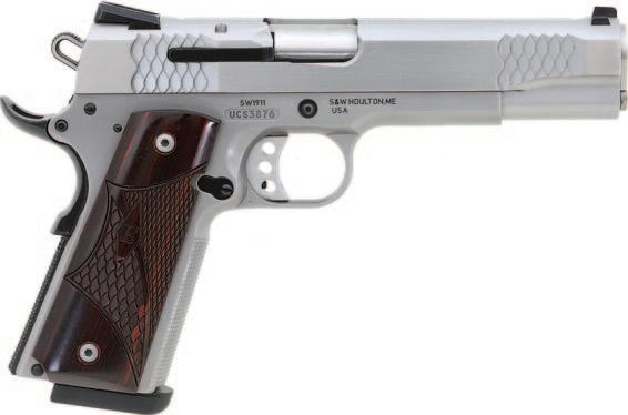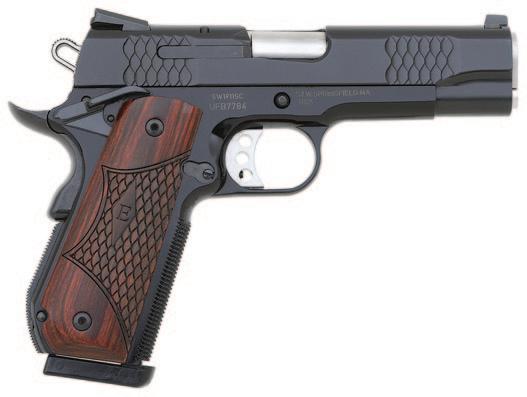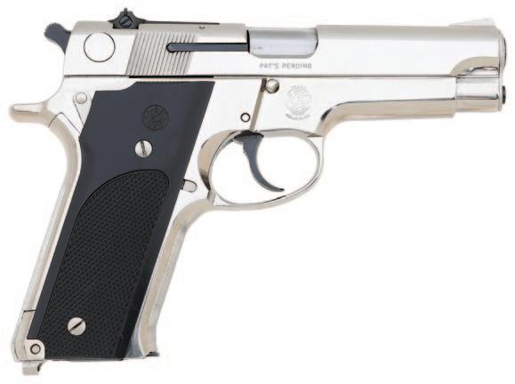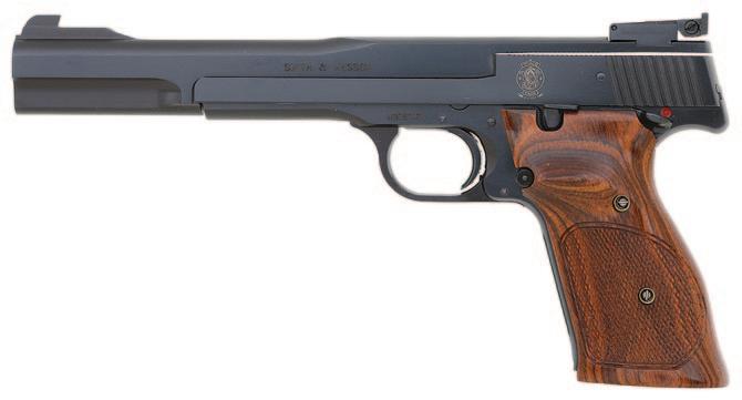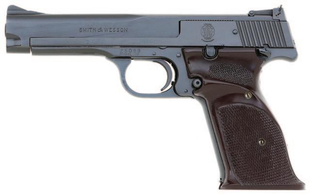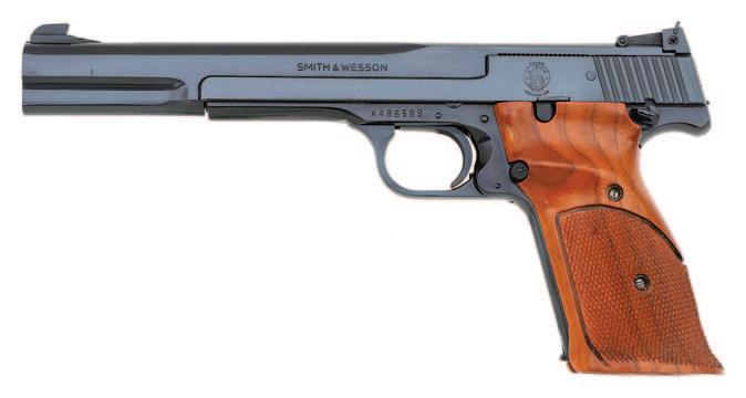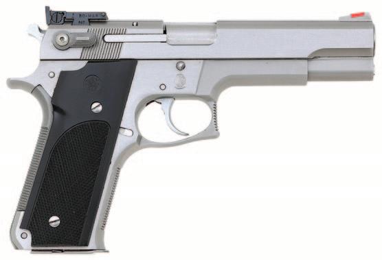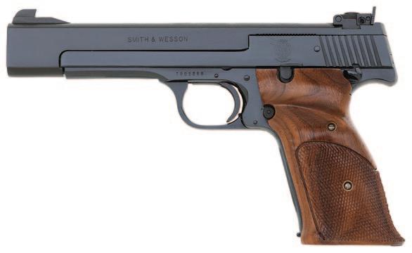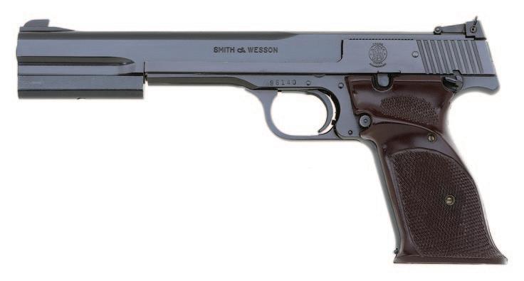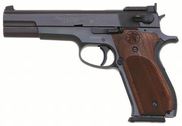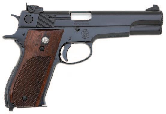 serial #KAZ0423, 9mm, 5” barrel with a bright excellent bore. This lovely single action only pistol remains in excellent condition and retains about 99% original blue showing minor edge wear. The checkered walnut factory grips have laser engraved S&W monograms and remain in excellent condition. This pistol features a post front sight, Wilson Combat Bo-Mar style adjustable rear sight, slide mounted hammer block safety, grip safety, and titanium nitride coated spherical barrel bushing. It includes a Performance Center locking aluminum hard case, a pair of factory nine-round magazines with removable floorplate, cleaning kit, sight adjustment tool (screwdriver), fired case, and manual. A very desirable and collectible pistol. (8A12041-2) {MODERN}