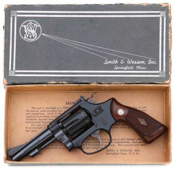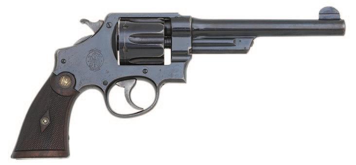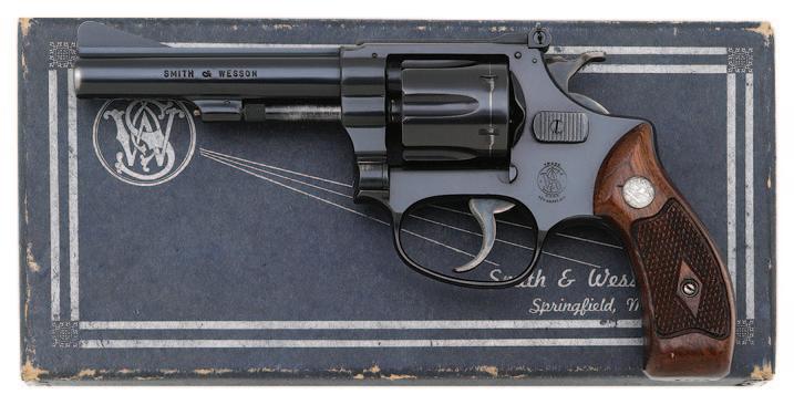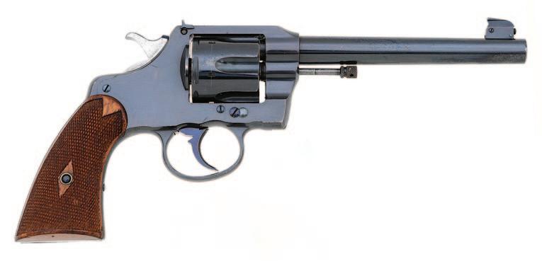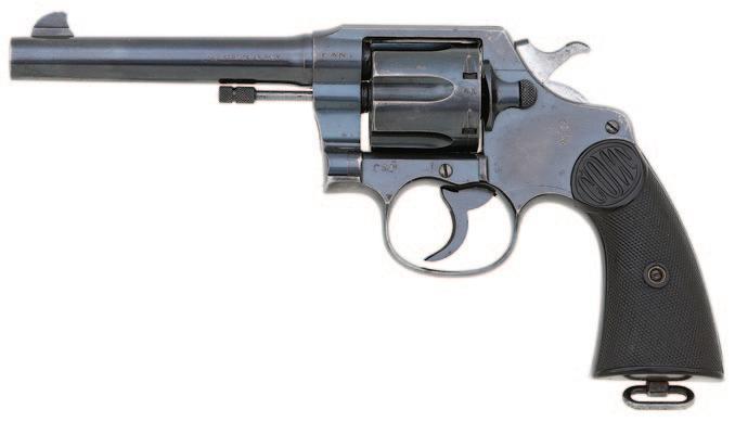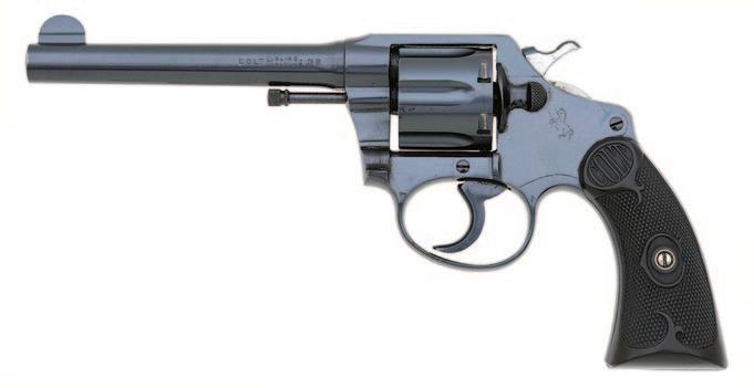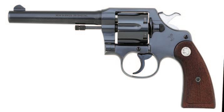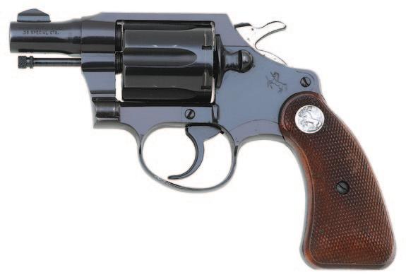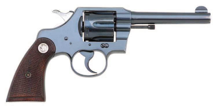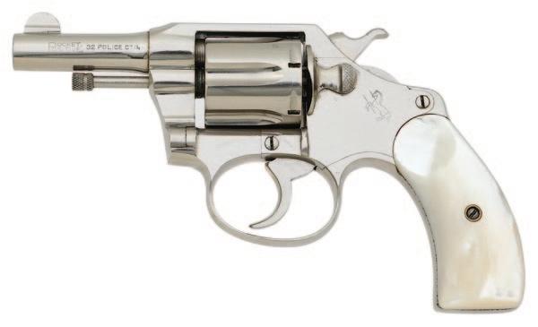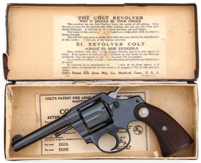 serial #329506, 32 Colt New Police (S&W Long), 4” barrel with a bright excellent bore. This lovely 1930 revolver remains asnew-in-box with the metal surfaces retaining about 99% plus original blue. The checkered service trigger and hammer retain full blue with bright sides on the hammer. The un-numbered fully checkered walnut factory grips feature silver Rampant Colt medallions and remain in excellent condition. This gun features a half-moon front sight and fixed rear sight. It includes the original hinged maroon factory box that is correctly end labeled and numbered to the gun and a Colt special instruction pamphlet. The box rates about good with light staining, the front and left edges have several splits, there is light edge wear, and light peeling of the cloth backed covering along the hinge. The pamphlet rates good with oil staining. A truly fine example of a pre-war Police Positive. (8A11728-1565) {C&R} (1000/1500)