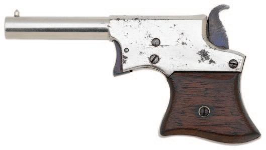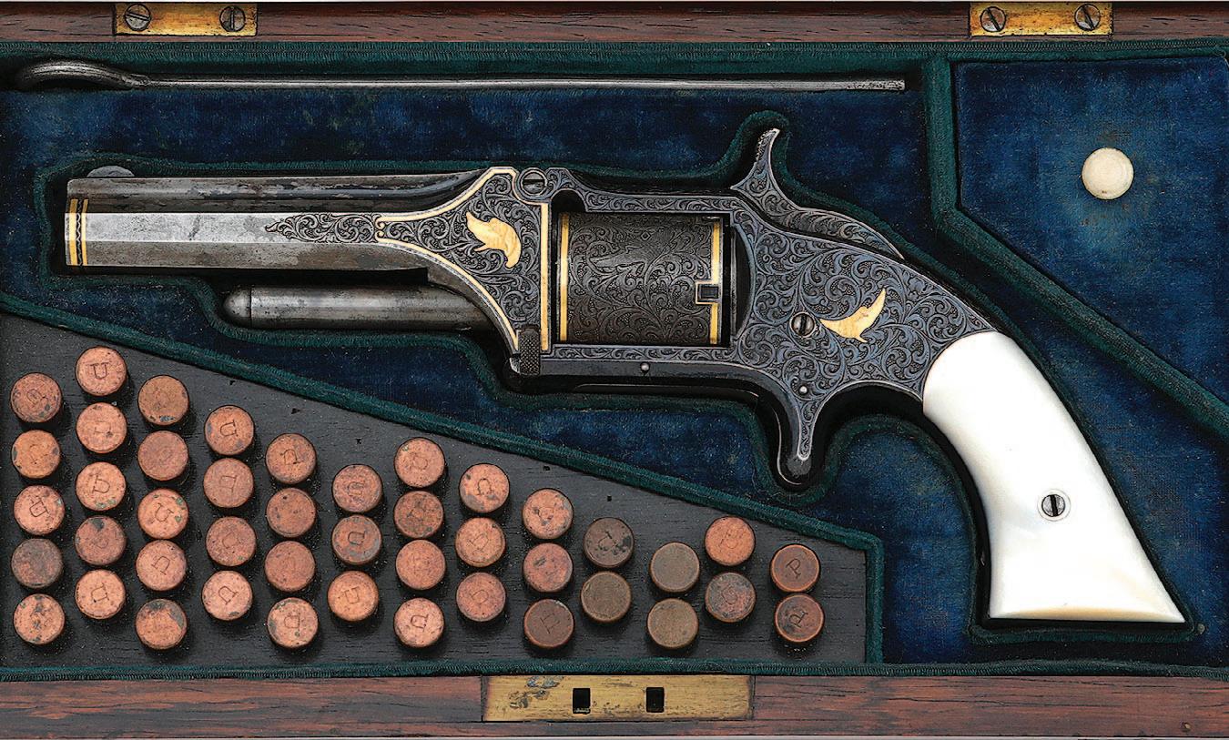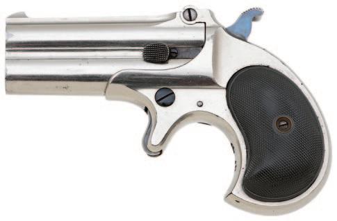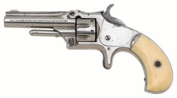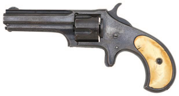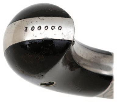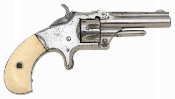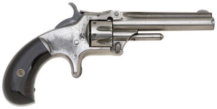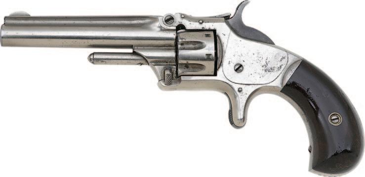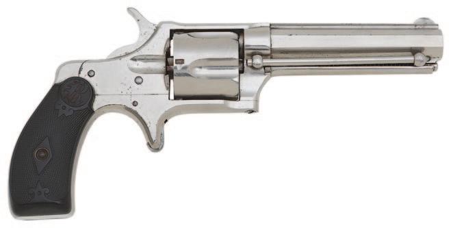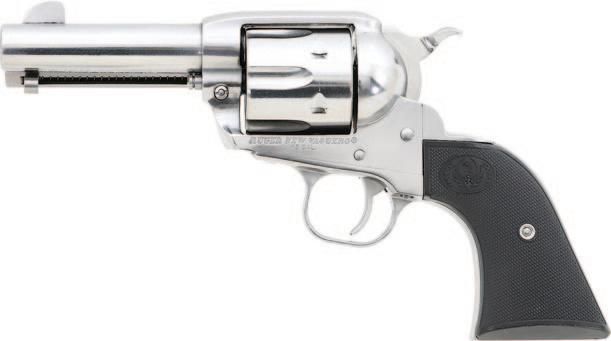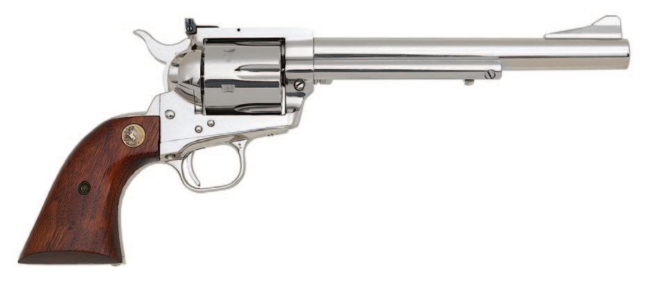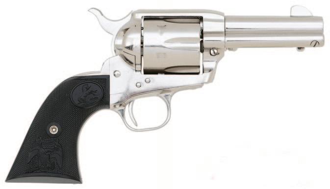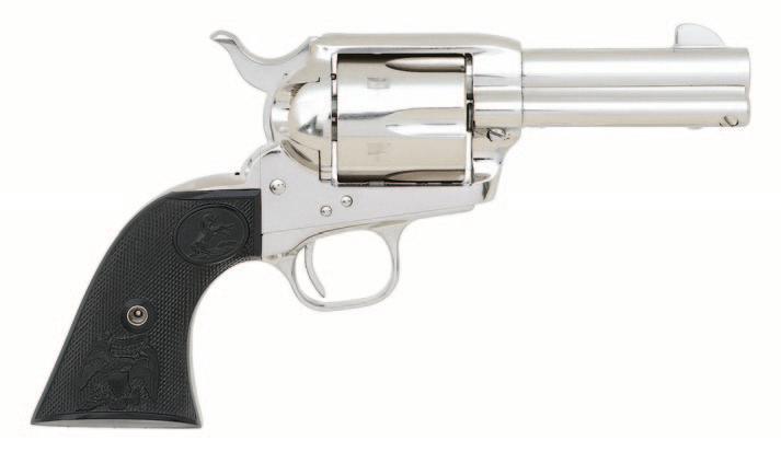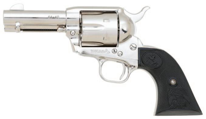 serial #S15572A, 44-40 W.C.F., 3 1/2” barrel with a bright excellent bore. This interesting 1998-manufactured Single Action Army is equipped with an unusual 3 1/2” barrel but retains the ejector rod housing unit unlike the Storekeeper or Sheriff’s Models. This beautiful gun is as-new-in-box and unfired. It retains about 99% plus original nickel. The un-numbered checkered