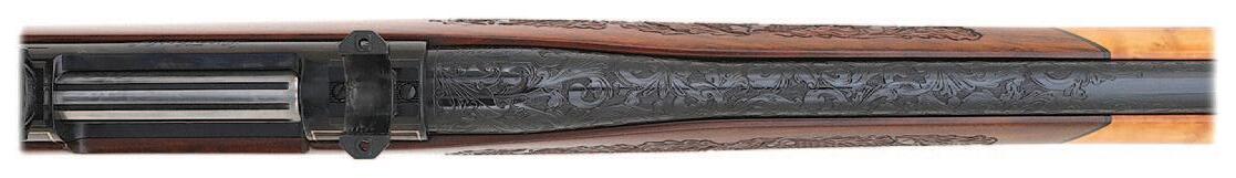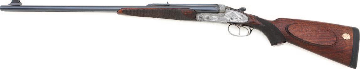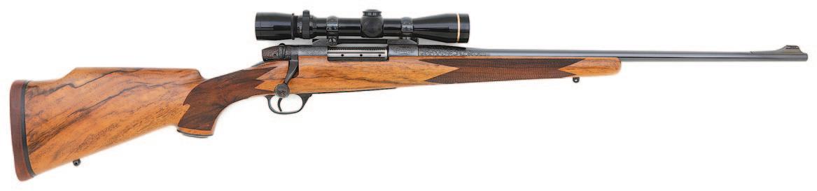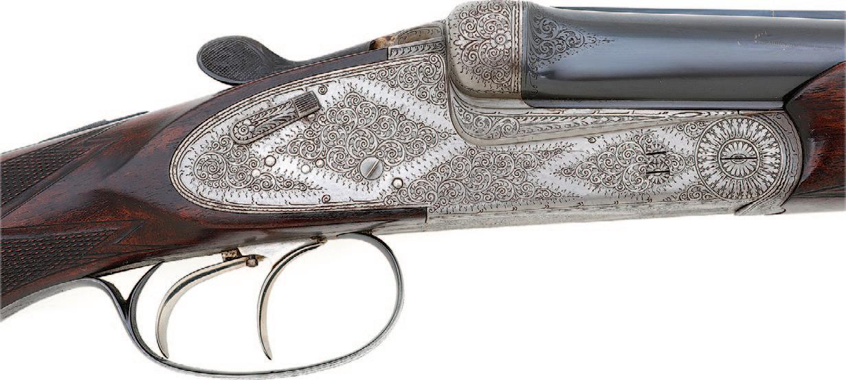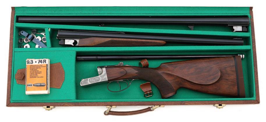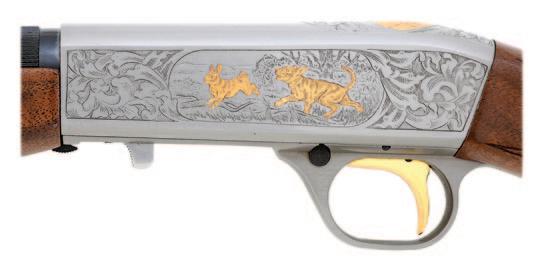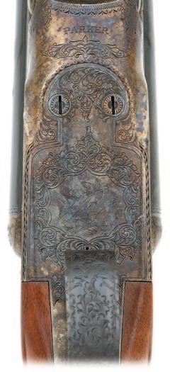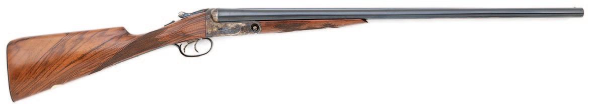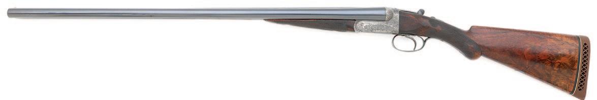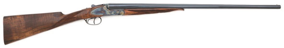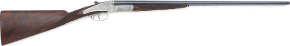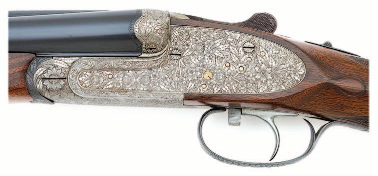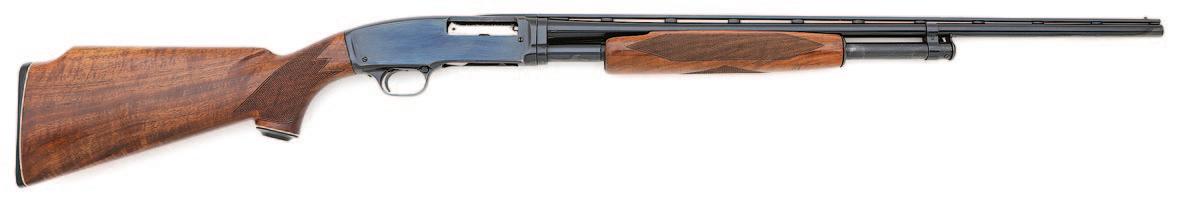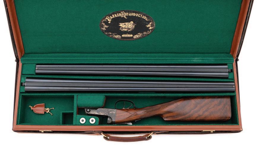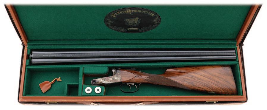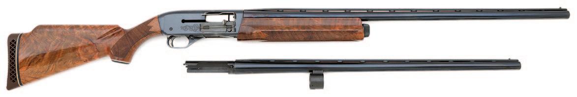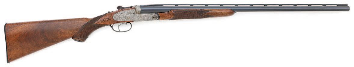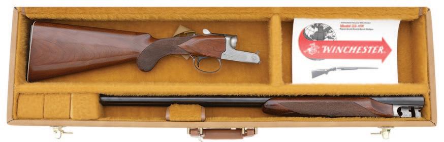 scroll and rosette engraving, attractive bordering, floral motifs on the fences and hinge pin, and depict a pair of woodcock on the left and a setter on the right, and a silver inlaid pigeon alights atop the lever; the trigger retains nearly all its gold finish with just a touch of operational wear. The checkered pistolgrip walnut stock and forend are very good plus to near excellent condition with a few very fine scratches on the right side of the butt and a couple scattered light handling marks, and features an attractive satin finish, sling swivels, a 14 1/8” length of pull to the factory black plastic buttplate, and an unen graved oval monogram plate on the toeline. The shotgun locks up tight and on-face with the lever coming to rest right of center and features a single selective inertial trigger, nonautomatic safety, robust ejectors, and is sighted with a lone steel bead on the matted rib. The shotgun appears to function well mechanically and included is the factory Styrofoam box showing moderate storage wear and light tape-repaired tears. (14B12028-4) {