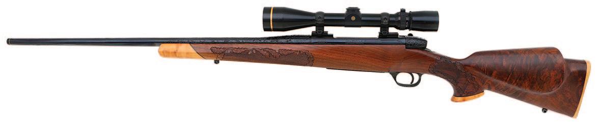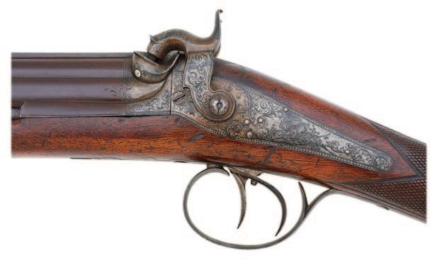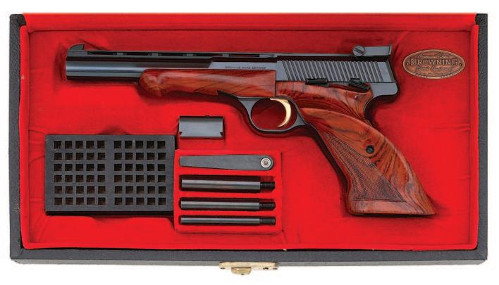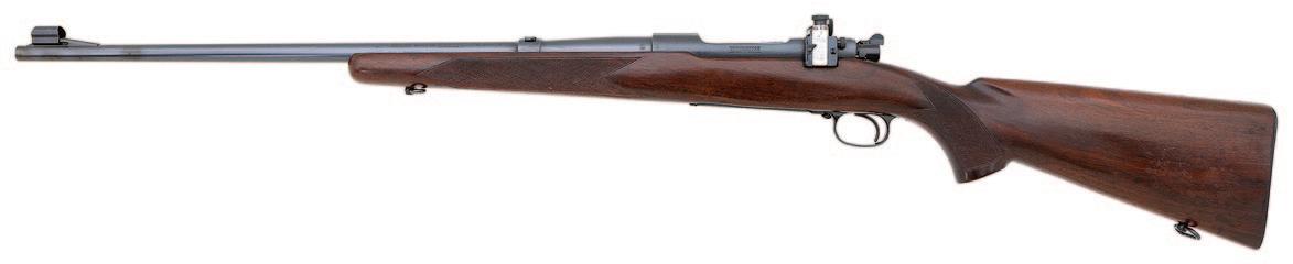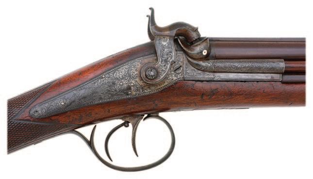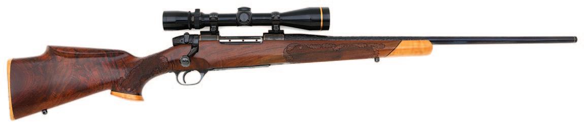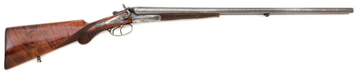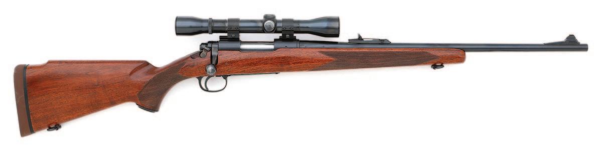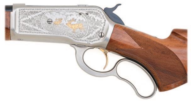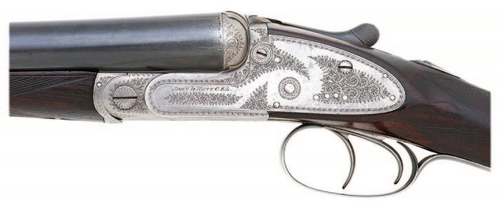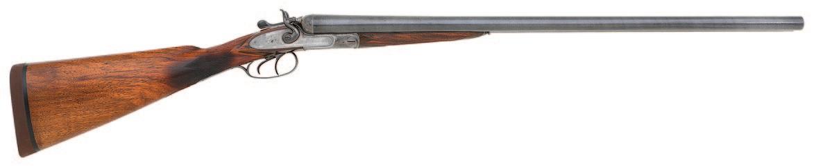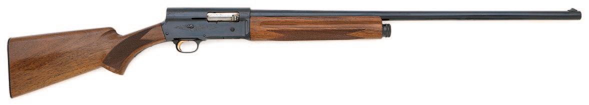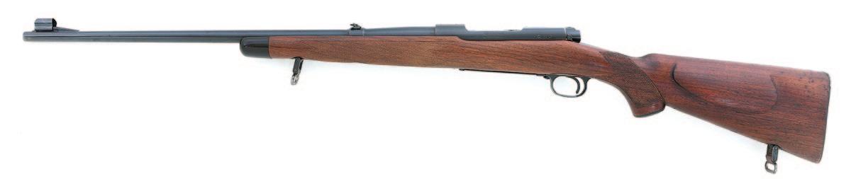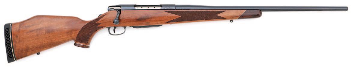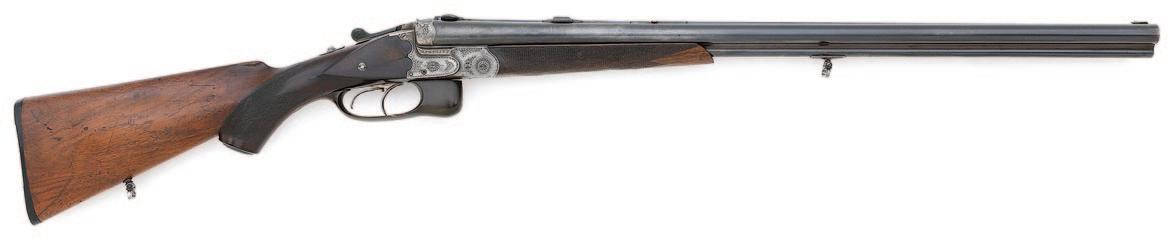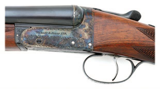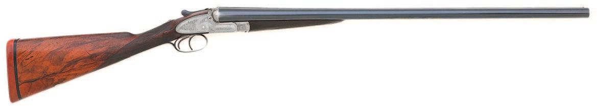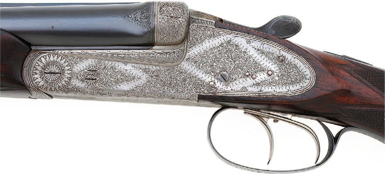 scroll and rosette engraving, attractive bordering, floral motifs on the fences and hinge pin, and depict a pair of woodcock on the left and a setter on the right, and a silver inlaid pigeon alights atop the lever; the trigger retains nearly all its gold finish with just a touch of operational wear. The checkered pistolgrip walnut stock and forend are very good plus to near excellent condition with a few very fine scratches on the right side of the butt and a couple scattered light handling marks, and features an attractive satin finish, sling swivels, a 14 1/8” length of pull to the factory black plastic buttplate, and an unen graved oval monogram plate on the toeline. The shotgun locks up tight and on-face with the lever coming to rest right of center and features a single selective inertial trigger, nonautomatic safety, robust ejectors, and is sighted with a lone steel bead on the matted rib. The shotgun appears to function well mechanically and included is the factory Styrofoam box showing moderate storage wear and light tape-repaired tears. (14B12028-4) {