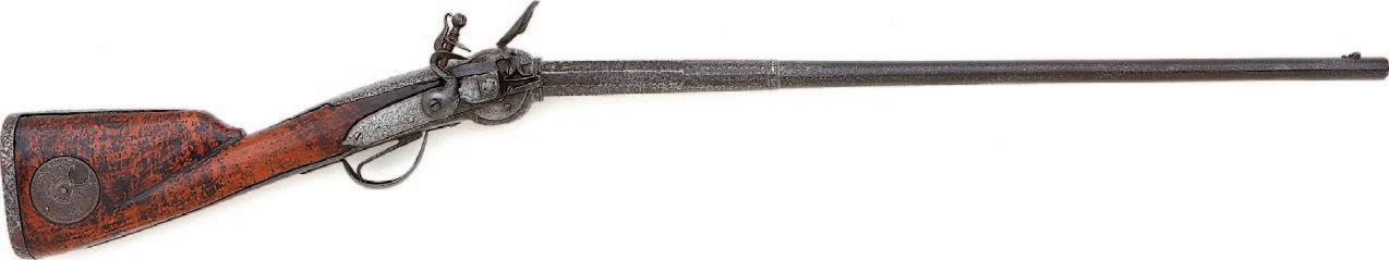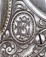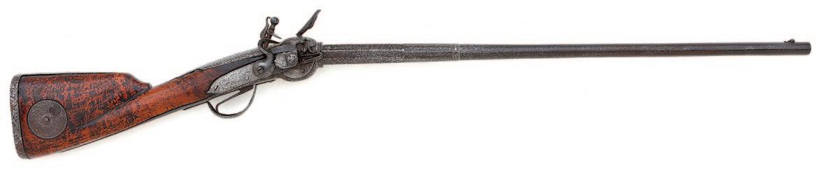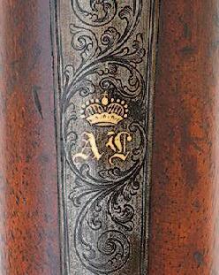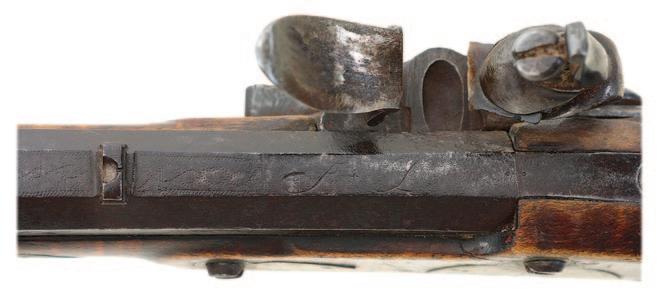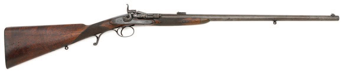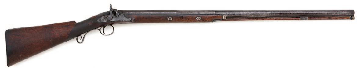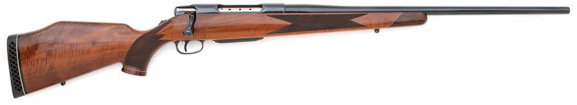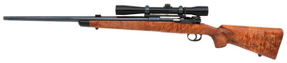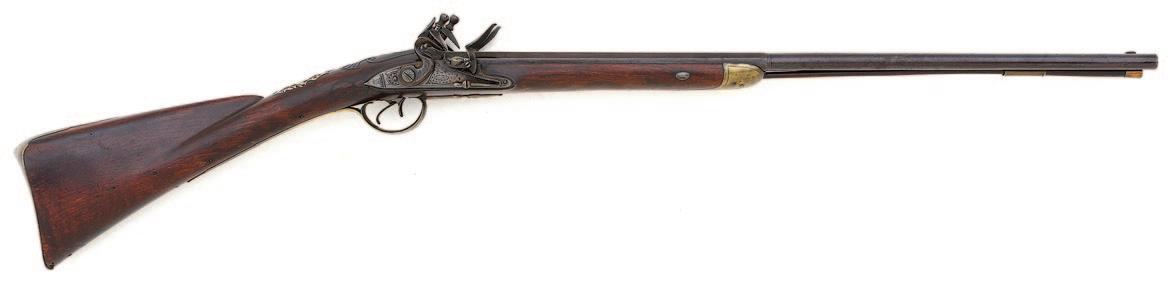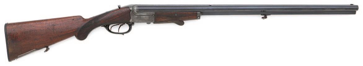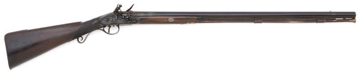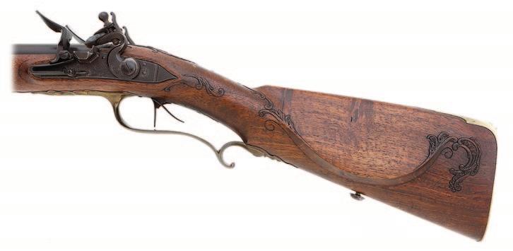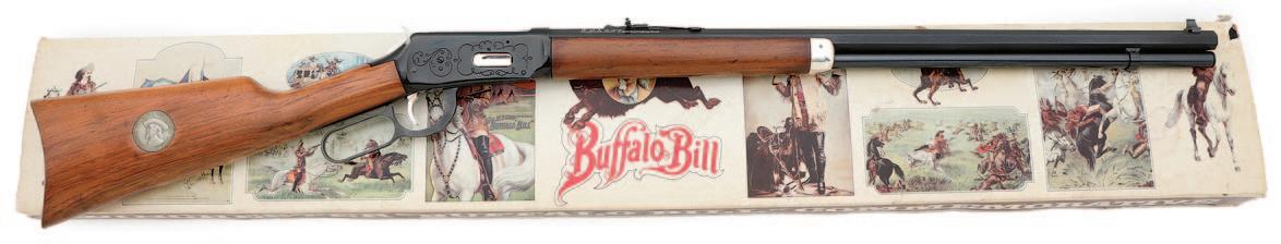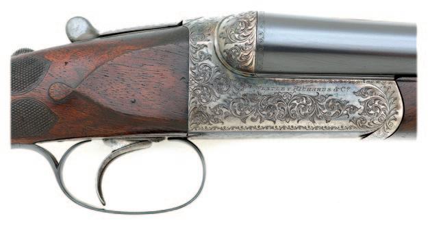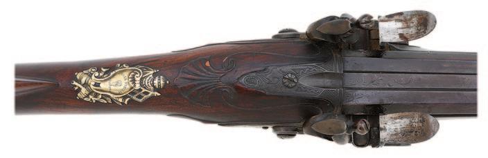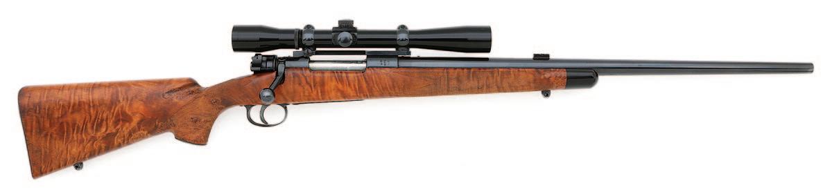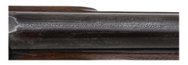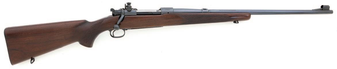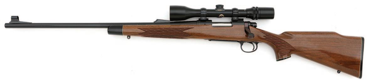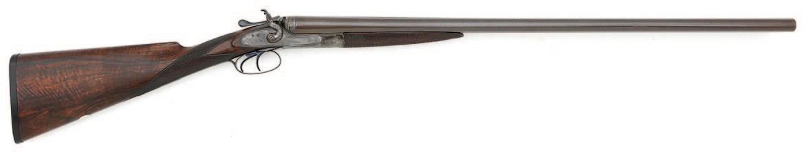 scroll and rosette engraving, attractive bordering, floral motifs on the fences and hinge pin, and depict a pair of woodcock on the left and a setter on the right, and a silver inlaid pigeon alights atop the lever; the trigger retains nearly all its gold finish with just a touch of operational wear. The checkered pistolgrip walnut stock and forend are very good plus to near excellent condition with a few very fine scratches on the right side of the butt and a couple scattered light handling marks, and features an attractive satin finish, sling swivels, a 14 1/8” length of pull to the factory black plastic buttplate, and an unen graved oval monogram plate on the toeline. The shotgun locks up tight and on-face with the lever coming to rest right of center and features a single selective inertial trigger, nonautomatic safety, robust ejectors, and is sighted with a lone steel bead on the matted rib. The shotgun appears to function well mechanically and included is the factory Styrofoam box showing moderate storage wear and light tape-repaired tears. (14B12028-4) {