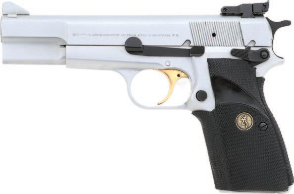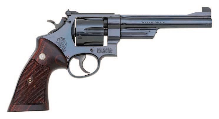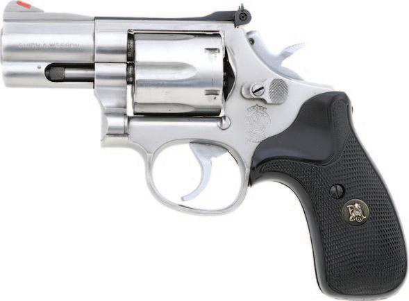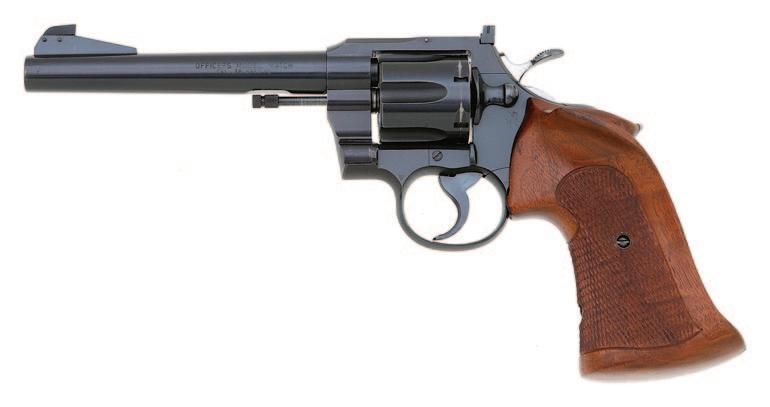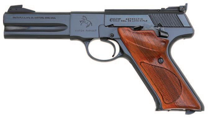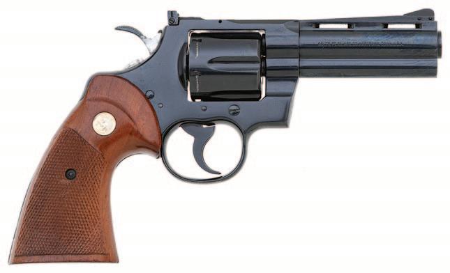 of the frame and triggerguard. The serrated service trigger and target Hammer retain full blue while the sides of the hammer remain bright with light operational wear and stains. The checkered third type factory walnut target grips feature gold Rampant Colt medallions and rate very good plus with the finish on the butt area clouded and there is a black spot on the left panel caused by a tiny worm hole that was not filled by the factory. It is sighted with a serrated ramp front sight, Colt Accro adjustable black blade rear sight, and functions mechanically. A fine example of the Python. (8B11728-1421) {C&R} (1800/2800)