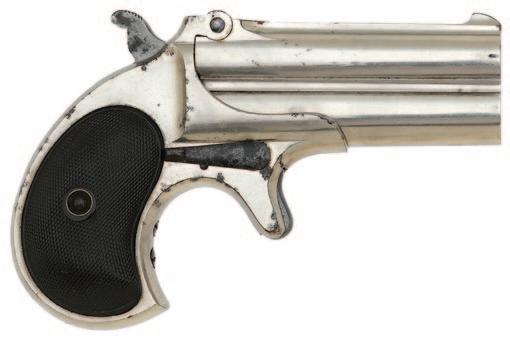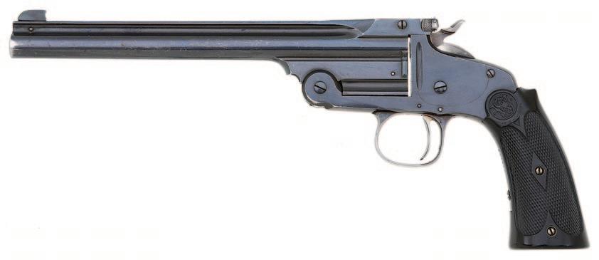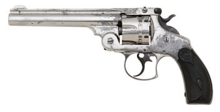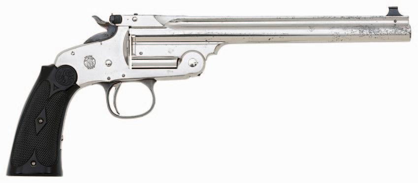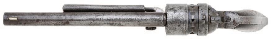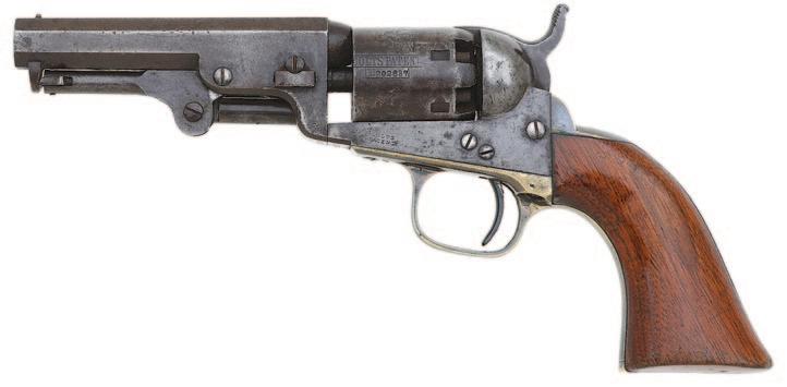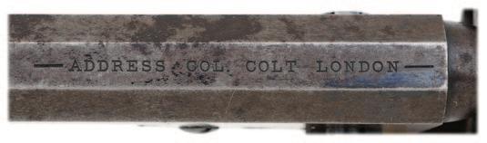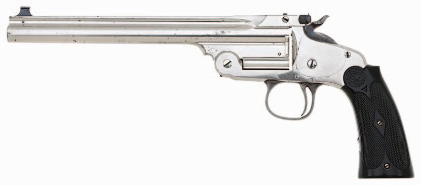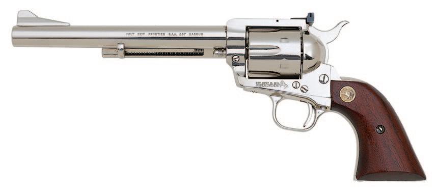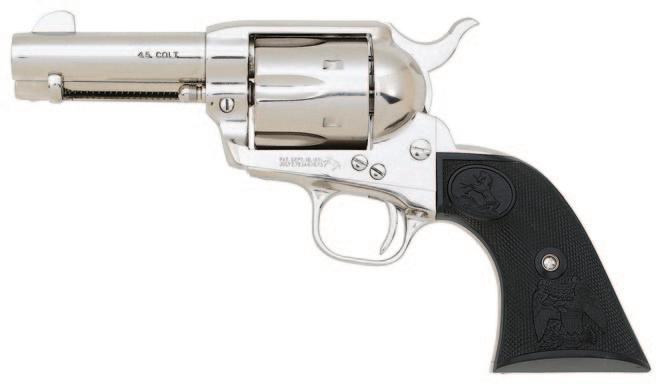 serial #S24097A, 45 Colt, 3 1/2” barrel with a bright excellent bore. This lovely 1998-manufac tured Single Action Army is equipped with an unusual 3 1/2” barrel but retains the ejector rod housing unit unlike the Storekeeper or Sheriff’s Models. This gorgeous gun is as-new-in-box and retains about 99% plus original nickel. The checkered synthetic factory eagle grips are numbered to the gun and feature a Rampant Colt in an oval and remain in excellent condition. This gun has standard Single Action Army features, all appropriate parts are correctly numbered to the gun, and is caliber marked “45 Colt” on the barrel. It includes the original factory box that is correctly end labeled and numbered to the gun, manual, and paperwork. A fantastic opportunity to add this scarce and unusual variant to your collection and it would make a great companion piece to the gun in the preceding lot. (8B11728-1430) {