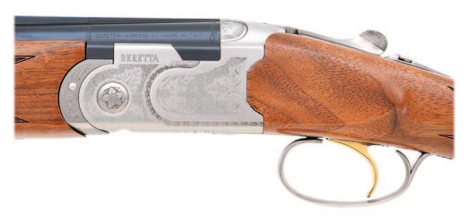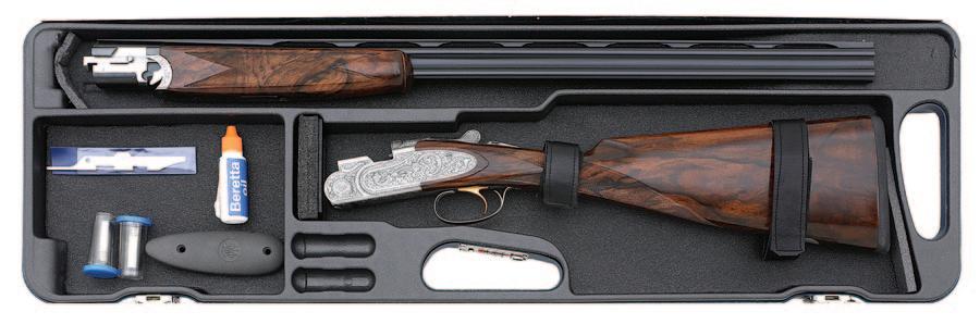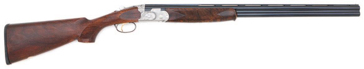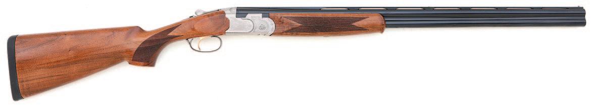 ture the beginnings of attractive grain figure throughout, a subtle schnabel forend, and an unengraved oval monogram plate on toe line. Length of pull to the rubber Beretta buttpad is 14 3/8”. The shotgun locks up tight and on-face with the lever coming to rest well right of center and features an automatic safety, an inertial single selective trigger, robust ejectors, and is sighted with a lone steel bead on the nicely matted rib. The shotgun appears to func tion well mechanically and included is a factory hardcase, five Mo bilchokes marked cylinder, improved cylinder, modified, improved modified, and full, an alternate hard plastic buttplate, choke wrench, and manual. A lovely smallbore Beretta that appears un used. (14B12028-6) {MODERN} (1200/1800)