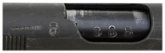 serial #240836, 45 ACP, 5” Colt barrel with a bright excellent bore. The barrel has the sideways “P/H” Type 4 proof and inspection marks. This lovely pistol retains about 92% original blue, most of the loss is on the slide and frame with areas lightly thinning to brown although there is one small spot of pitting on the slide in addition to slight edge wear and a few minor handling and