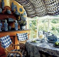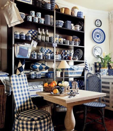 Add a third, fourth, fifth – however many the scale and economics of the piece will stand – and the whole thing will come together in a delicious melting pot. The kitchen is probably the room with the most potential for exploiting this bold application. At its most informal and eclectic materials, ornaments and artefacts with a broad provenance can be introduced in as informal a collaboration as you like –there is no room for a timid hand when the blue-and-white saturation look is sought. The idea is to put together all manner of patterned fabrics – checks, chintzes, toiles, spots, stripes – and use them as blinds, slipcovers, cushions, napkins, tablecloths and curtains. Off-cuts could be framed instead of pictures, tea towels may be wrapped around ceiling light flexes by way of disguise or draped, handkerchief-style, to transform a boring lampshade. If