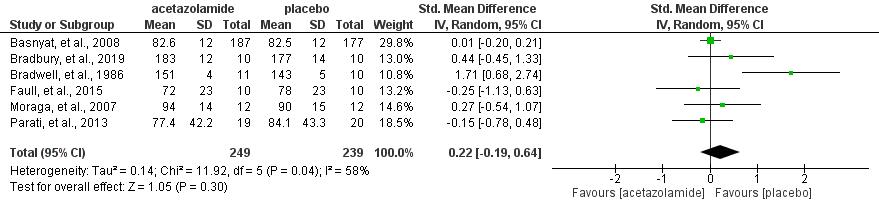 Result: Lake Louise Score declining with a significant pooled mean difference (MD) of -1.16 [95%CI: (-1.90) - (-0.41), P = 0.002]. Arterial oxygenation improvement with a significant pooled main difference (MD) of 3.18 [95% CI: (2.19) (4.17), P < 0.00001]. Heart rate measurement without significant effect, (MD) of (-0.1 [95% CI: (-7.26)-6.68, P = 0.96]
