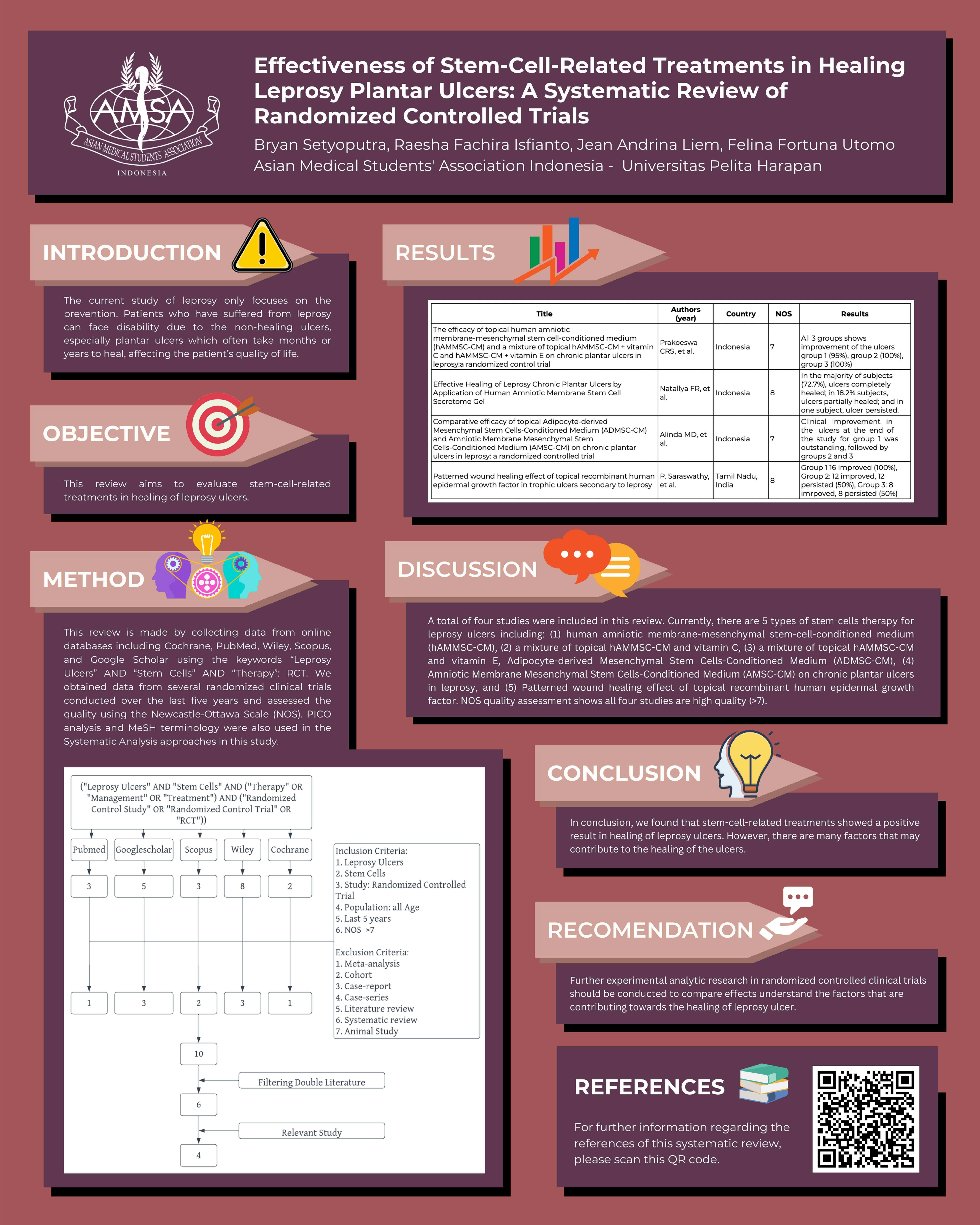 In conclusion, we found that stem-cell-related treatments showed a positive result in healing of leprosy ulcers. However, there are many factors that may contribute to the healing of the ulcers. Further studies regarding this are needed to optimize the management.