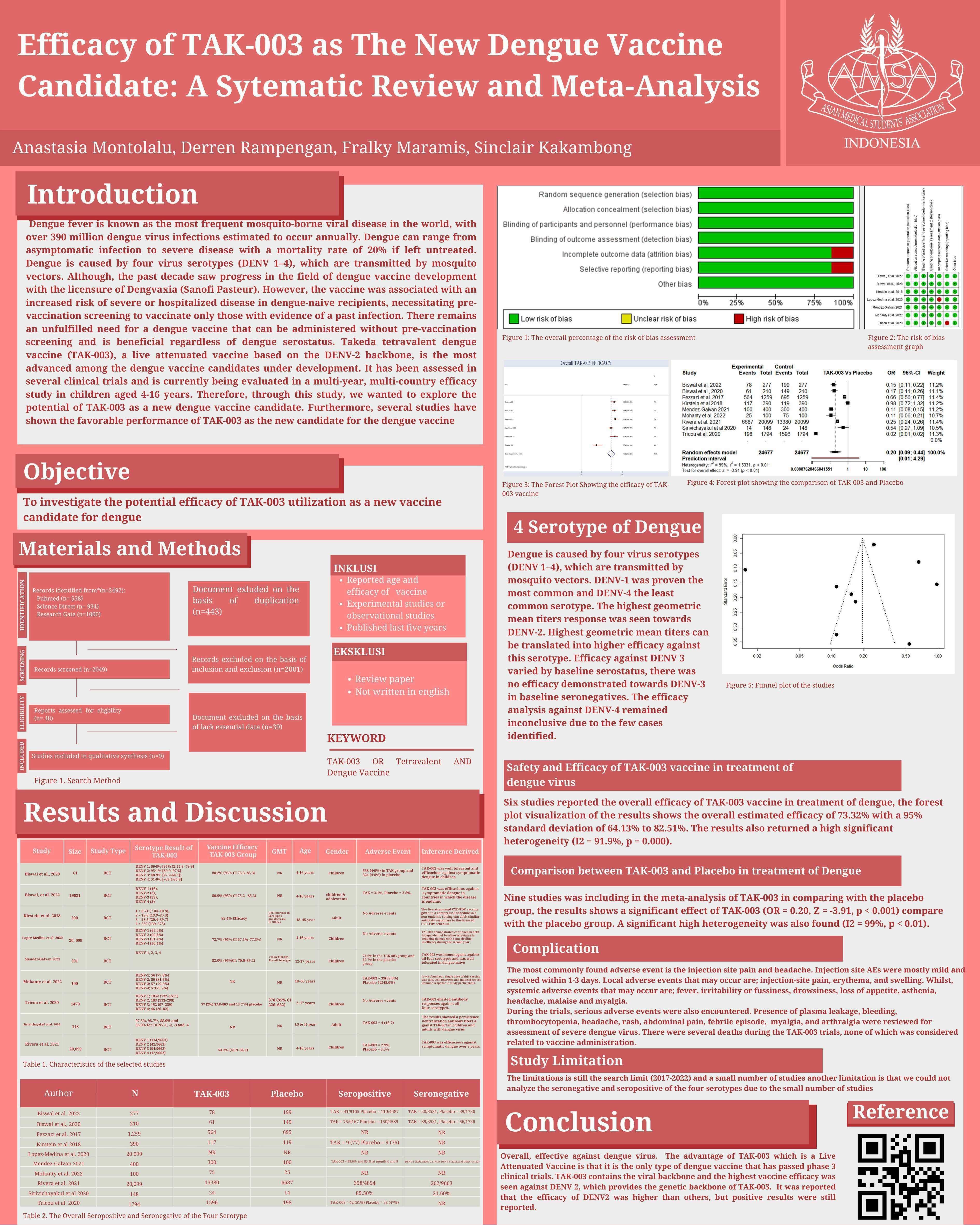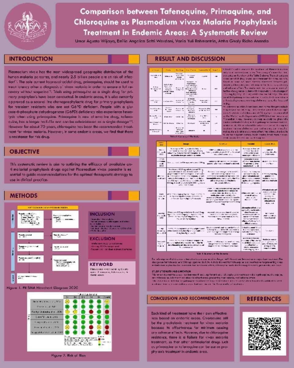 Introduction: Nowadays,LymphaticFilariasisisoneoftheendemicdiseasesinseveral areasdouble-drugregimen(DDR)treatmentforLymphaticFilariasisfacesmany disadvantagesforinstanceinneedsofmultipleroundsofadministrationandunabletolimit thetransmissionofmicrofilariainendemicdisease.Anewregimenhasbeenfoundcalledthe triple-drugregimen(TDR)anditshowsapromisingfuture.Therefore,wewanttoevaluate thesafetyandefficacyofTDRbycomparingitwithDDRespeciallyinendemic areas. Methods: DatawascollectedfromPubMed,Cochrane,ScienceDirect,andProQuestfrom 2018-2022.StudySelectionprocessbasedonPRISMAstatementandqualityassessmentwas conductedusingCochrane’sRiskofBiasToolinrandomisedtrials. Results: Threejournals reportclearanceofmicrofilariaobserved,TDRissuperiorcomparedtoDDR.However,three journalsthatreportedadverseevents,TDRhasahigherincidenceratecomparedtoDDR.In addition,accordingtotheonlyjournalthatreportedCFAclearance,DDRisalittlebitbetter thanTDR.Nevertheless,theadverseeventofTDRisstilltolerabletomostpeopleand similartoDDR. Conclusion: TDRinterpretsoutstandingdatacomparedtodoubledrug regimenintermsofefficacyandsafety.TDRisfasterinreducingmicrofilaria numberand circulatingfilariaantigeninthebodycausinglesstransmissionoffilaria.Inaddition,the adverseeventofaTDRissimilartoaDDR.Therefore,makingatriple-drugregimenis superiorandabetterchoicethanadouble-drugregimenfortreatinglymphaticfilariasisin endemic areas.