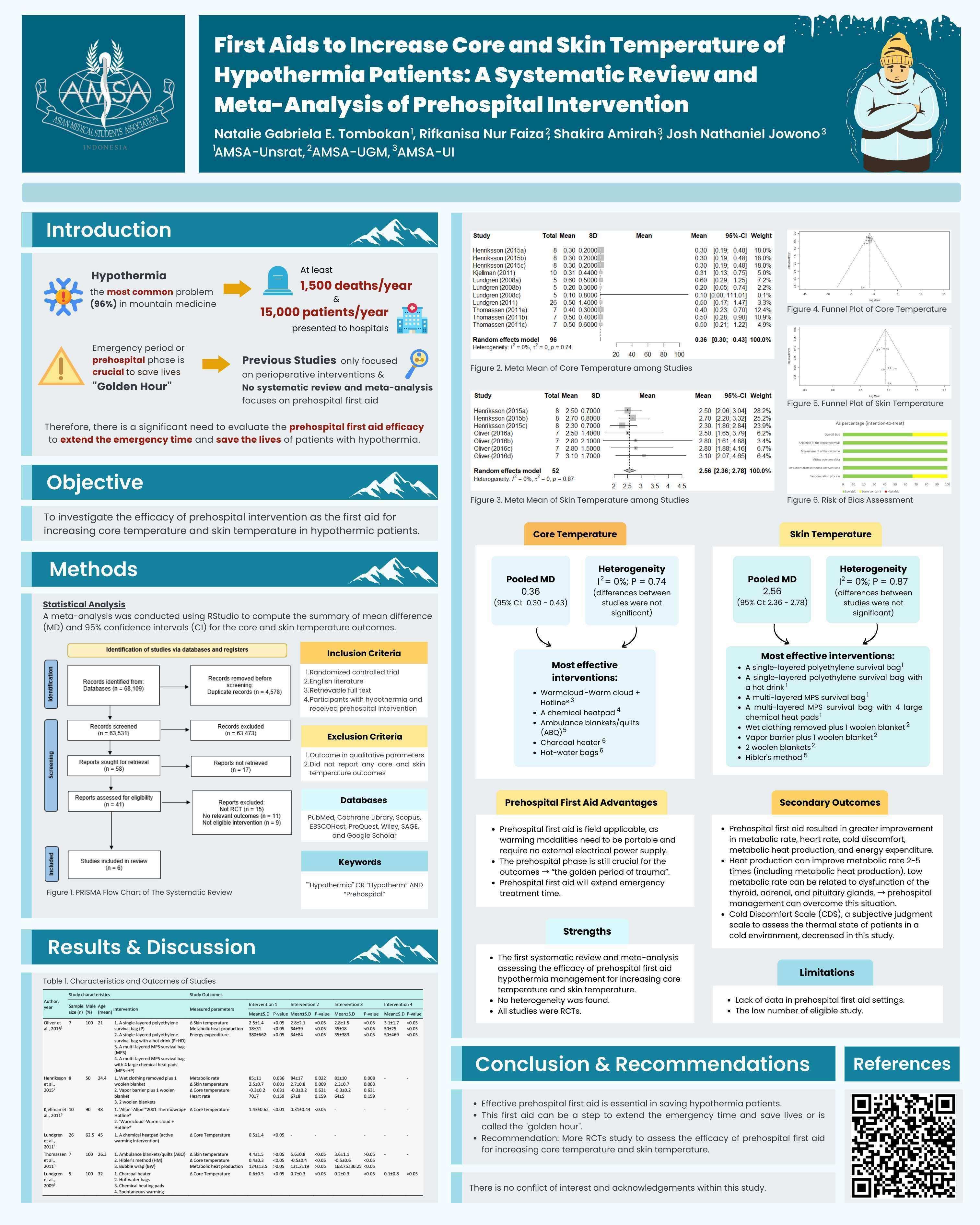 Results: Six randomized controlled trials (RCTs) with a total of 63 participants were included. The meta-mean of core and skin temperature shows a pooled MD of 0.36 (95% CI: 0.30−0.43) and 2.56 (95% CI: 2.36−2.78) respectively. The results indicate that those various prehospital interventions increased the core and skin temperature in hypothermic patients. Heterogeneity in terms of core (I2=0%) and skin temperature (I2=0%) was not found with P=0.74 and P=0.87 respectively, which means the differences between studies were not significant. Types of effective interventions on core and skin temperature are Warmcloud'-Warm cloud+Hotline®, chemical heatpad, ambulance blankets/quilts, charcoal heater, hot-water bags, single-layered polyethylene survival bag (plus hot drink), multilayered MPS survival bag (plus 4 large chemical heatpads), wet clothing removed or vapor barrier plus 1 woolen blanket, 2 woolen blankets, and Hibler's method.