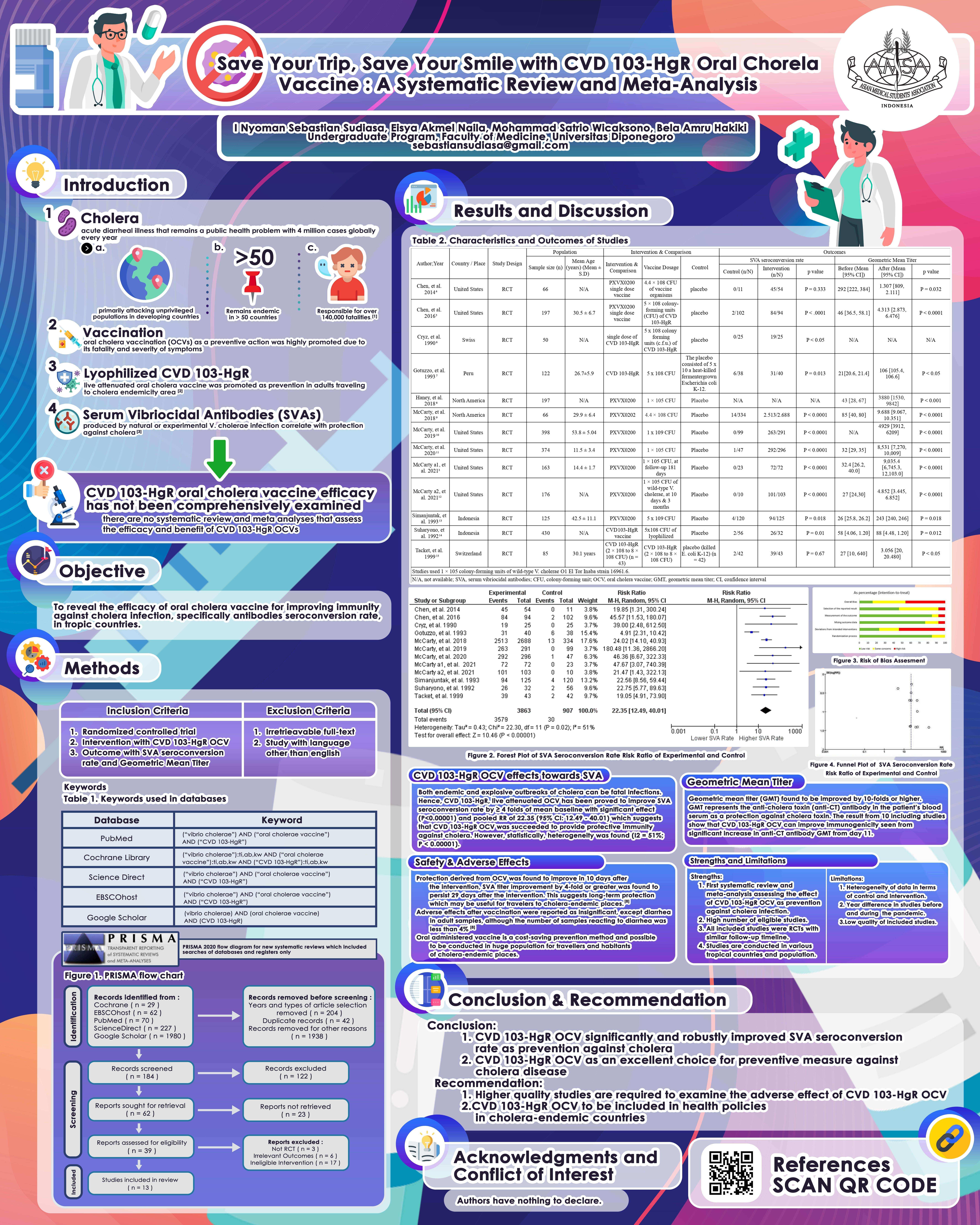 Thirteen studies were included in this study. We found that CVD 103-HgR OCV is effective to improve SVA. Thus, offer protection against cholera infection (Risk Ratio 22.35 [95% CI: 12.49 - 40.01, P < 0.00001]). CVD 103-HgR OCV also has been shown to significantly increase anti-CT antibody GMT (geometric mean titer), resulting in increasing immunogenicity. However, the data obtained shows heterogeneity(荊態> 40%).