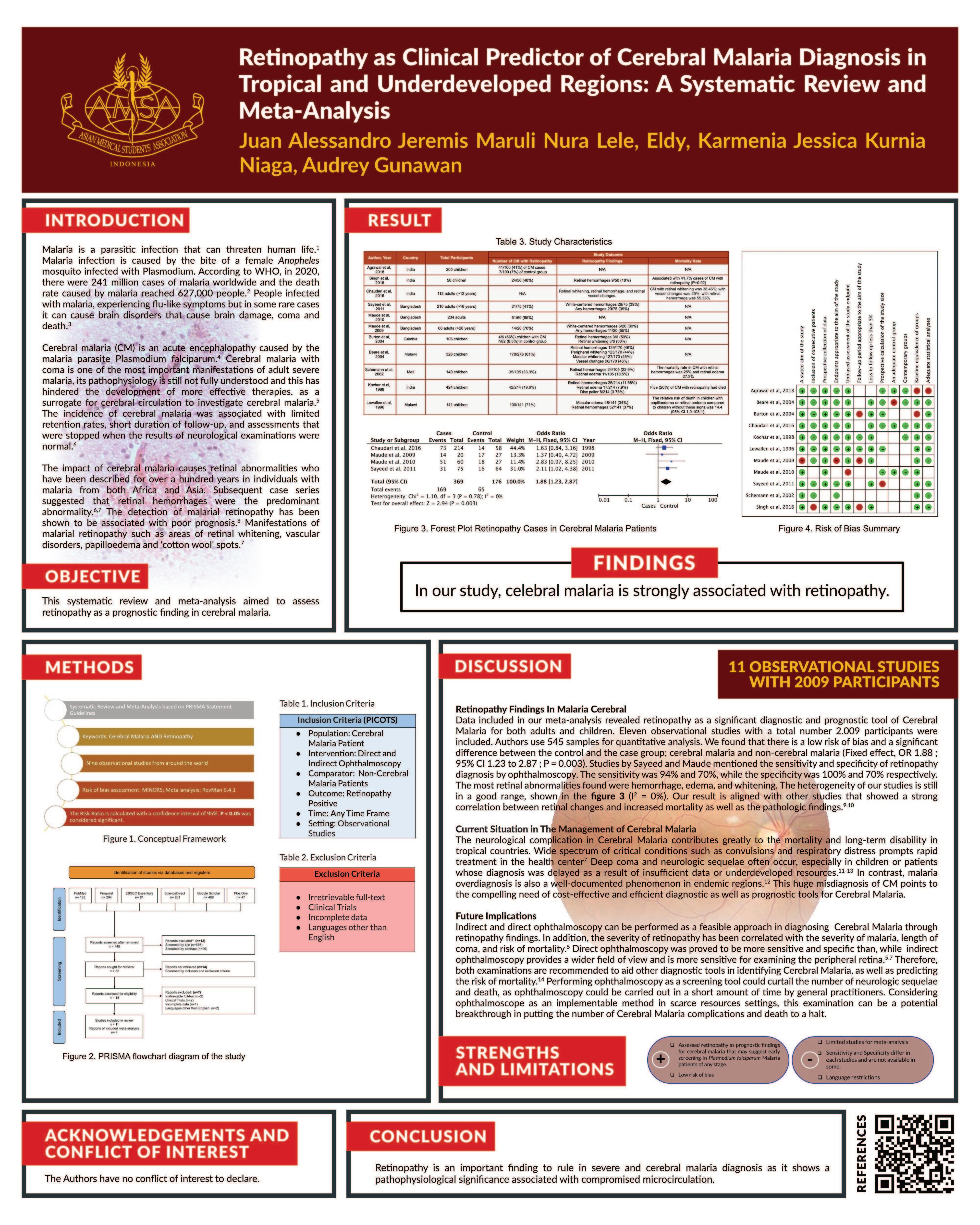 Method: This meta-analysis assessed observational studies. A comprehensive literature search was performed in Pubmed, Plos One, Proquest, EBSCO Essentials, ScienceDirect, and Google Scholar (Boolean operator). Review Manager 5.4.1 with Mantel Haenszel method was utilized to analyze the data extraction and methodological index was utilized to assess the risk of bias from the included studies i.e cerebral malaria patient compared to non-cerebral malaria, direct and indirect ophthalmoscopy, with the outcome is retinopathy positive. Odd Ratio is calculated with Confidence Interval of 95%. P<0.05 was considered significant.