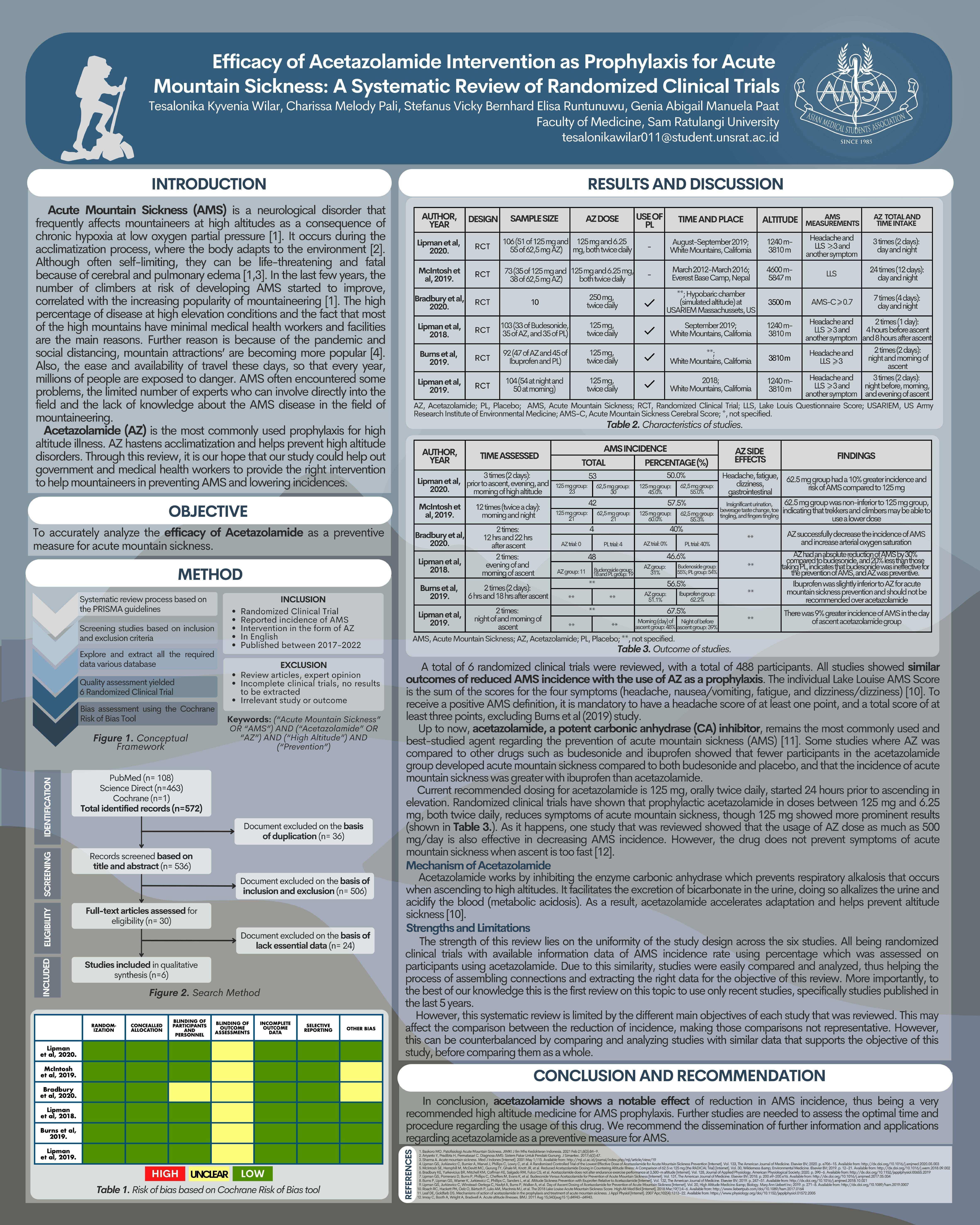 Method : ThissystematicreviewwascarriedoutbasedonthePRISMAguidelinefrommultipledatabases usingsetkeywords.WeperformedasystematicsearchinPubmed,ScienceDirect,and Cochrane forstudiesreportingtheusageofacetazolamideforthereductionofAMSincidence.Atotal of 572studieswerefoundandthenfilteredbasedontheinclusionandexclusioncriteria.Quality assessment for included studies was based on the Cochrane Risk of Bias tool.