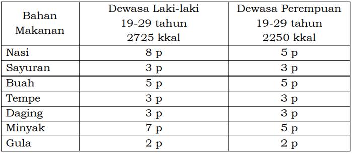 Tabel 6. Anjuran Jumlah Porsi Menurut Kecukupan Energi untuk Kelompok Umur 19 29 tahun perorang perhari .................................................................................................... 30 Tabel 7. Angka Kecukupan Energi, Protein, Lemak, Karbohidrat, Serat, dan Air yang dianjurkan (per orang per hari) ........................................................................................... 31