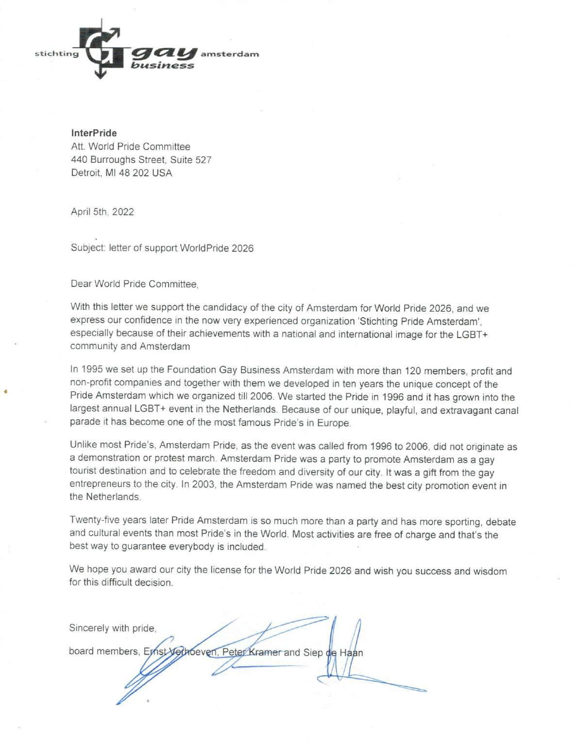 We write you in support of the Stichting Pride Amsterdam's application to host WorldPride in 2026. Stichting Pride Amsterdam has long demonstrated its ability to organize large-scale annual Pride events. Since 1996, the Stichting is responsible for the well-known Amsterdam Pride, a nine-day festival in Amsterdam with a broad program of Arts & Culture, Sports, Debate and Religious activities. All comes together during the last four days, for ihe biggest street party event of Amsterdam with stages all over the city centre, the world famous Canal Parade with many visitors from all over the world.