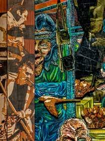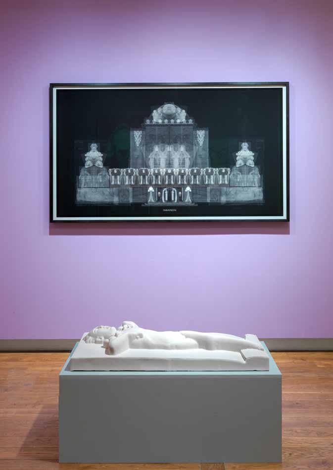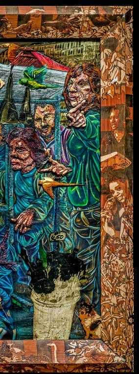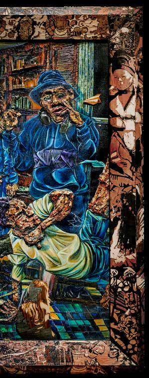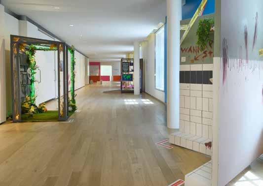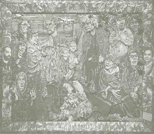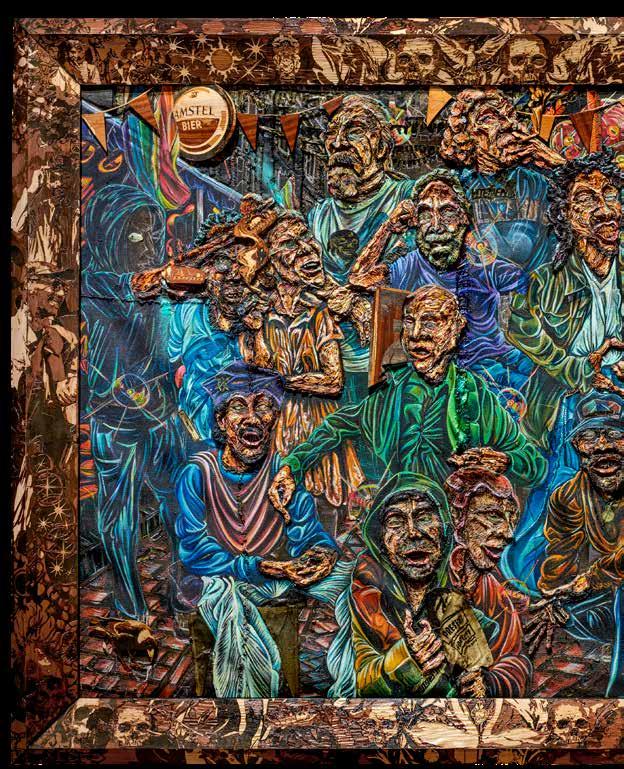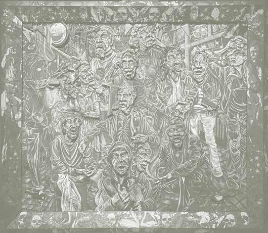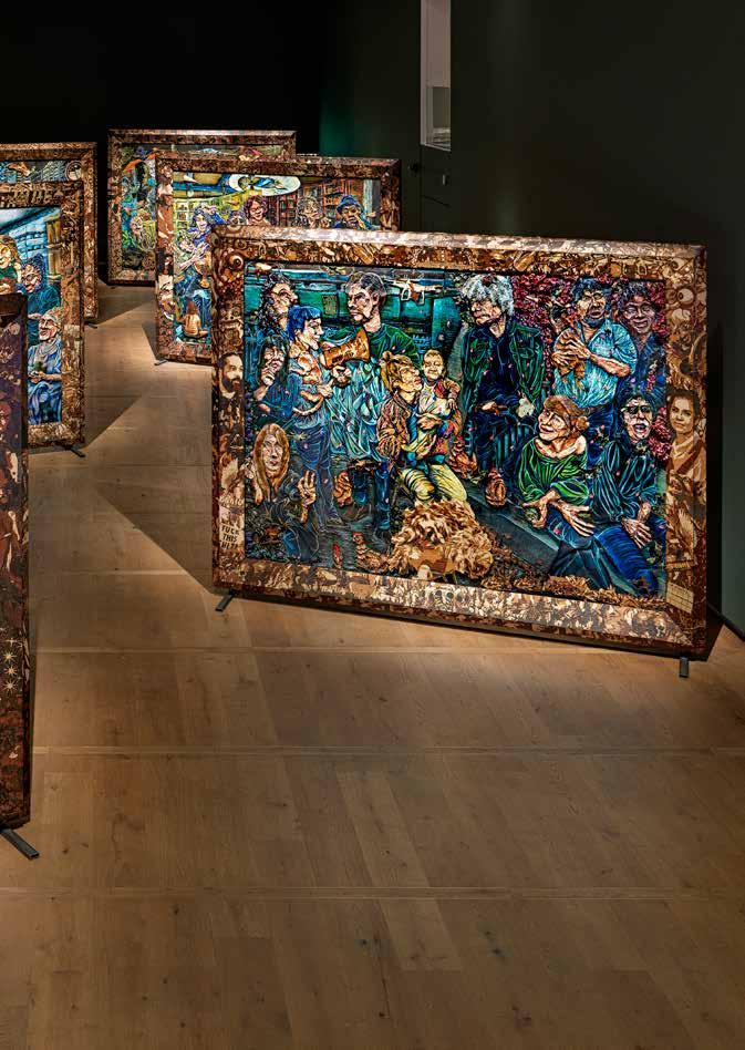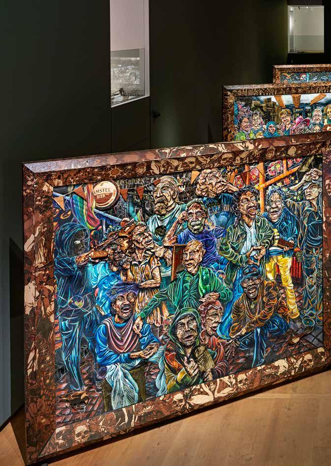 RvH Zeker, dat zie je ook aan de materialen die we hebben gebruikt in de werken . We gebruiken fineer en dat is zeker een knipoog naar de zeventiende­eeuwse technieken en houtbewerkingen van tropisch hardhout dat naar Nederland werd gehaald . Ik vind het belangrijk om vakkundig om te gaan met de vernieuwing van de technologie als het gaat om zulke levensgrote projecten . Het is traditionele schilderkunst maar ik gebruik verschillende mediums voor de verf . Zo wordt het heel onconventioneel, ook al hoort het nog steeds in die oude traditie . Want we halen wel alles van de muur af en zetten het neer als een installatie, maar in de basis is het nog steeds een portretzaal . De hele tijd dat spelen van oud naar nieuw is echt gewoon heerlijk .