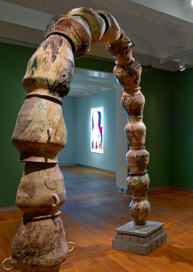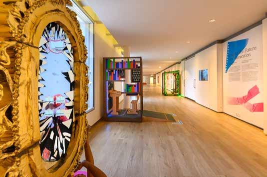Samen met curator Roberto Luis Martins kijkt Raquel vanaf het balkon uit op de kolossale werken .
