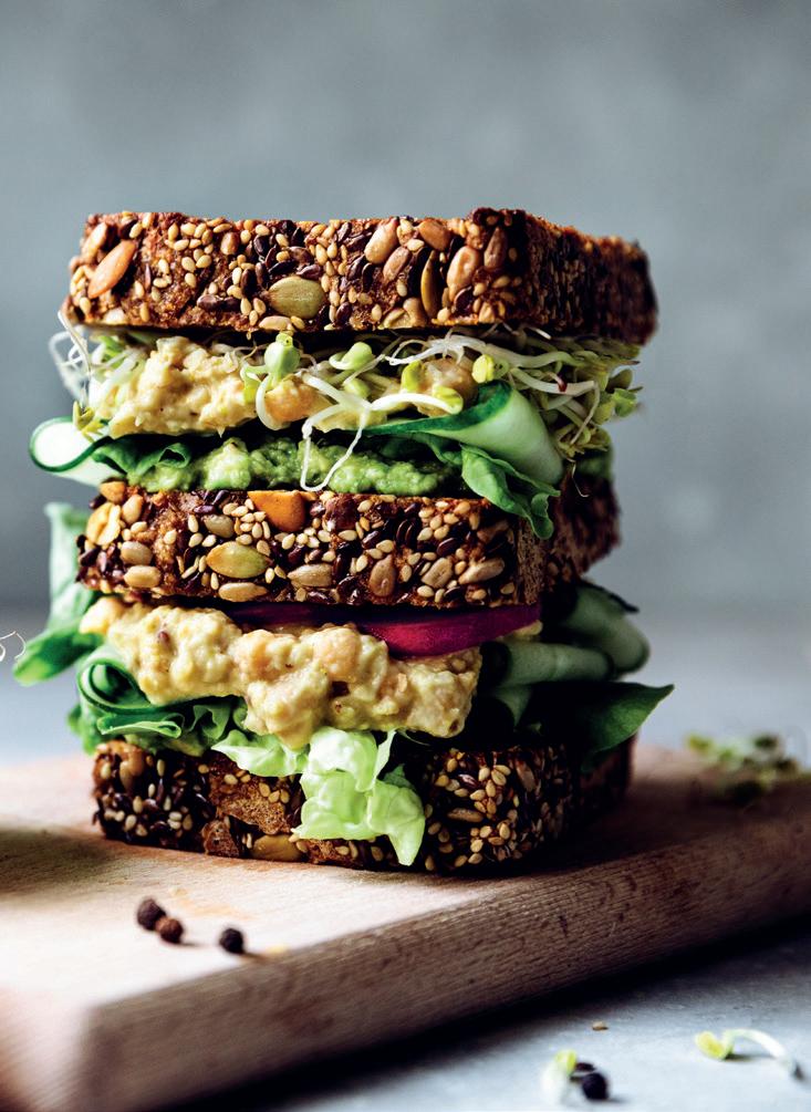 Wat heb je nodig? 3 dikke volkorenboterhammen • 1 avocado (geprakt) • hummus • linten komkommer • ijsbergsla • rode ui • alfalfa of taugé.