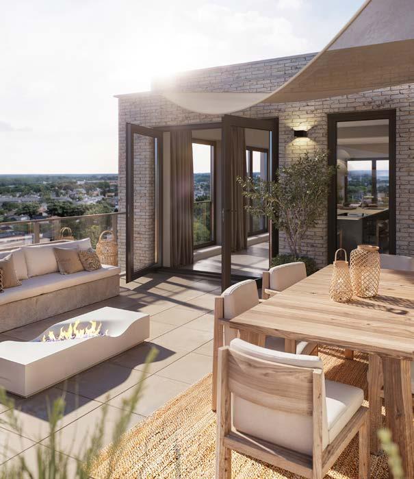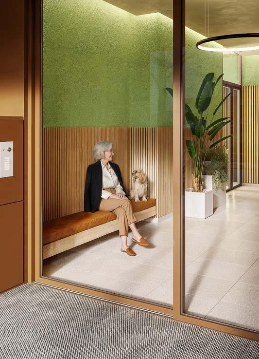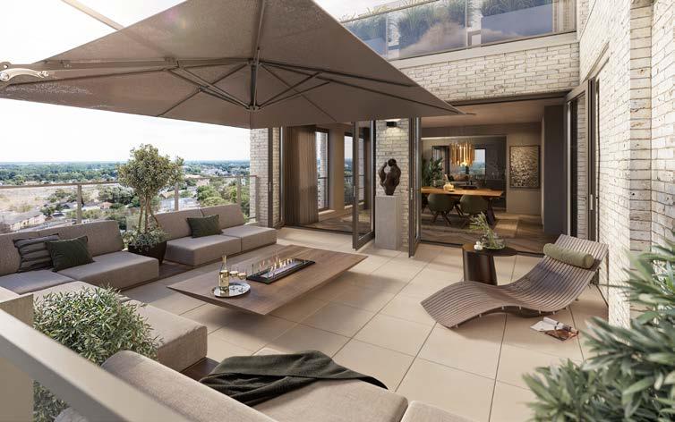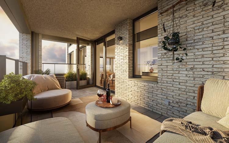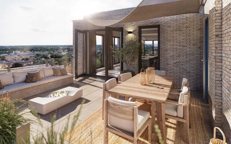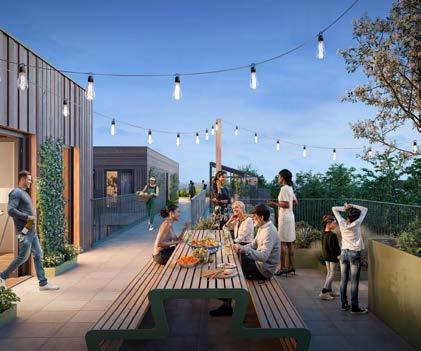 Die zijn voor alle bewoners. Alle dakterrassen worden door kenmerkende groene loopbruggen met elkaar verbonden. Je kunt er profiteren van de gezelligheid en het groepsgevoel, maar je kunt je ook rustig terugtrekken.