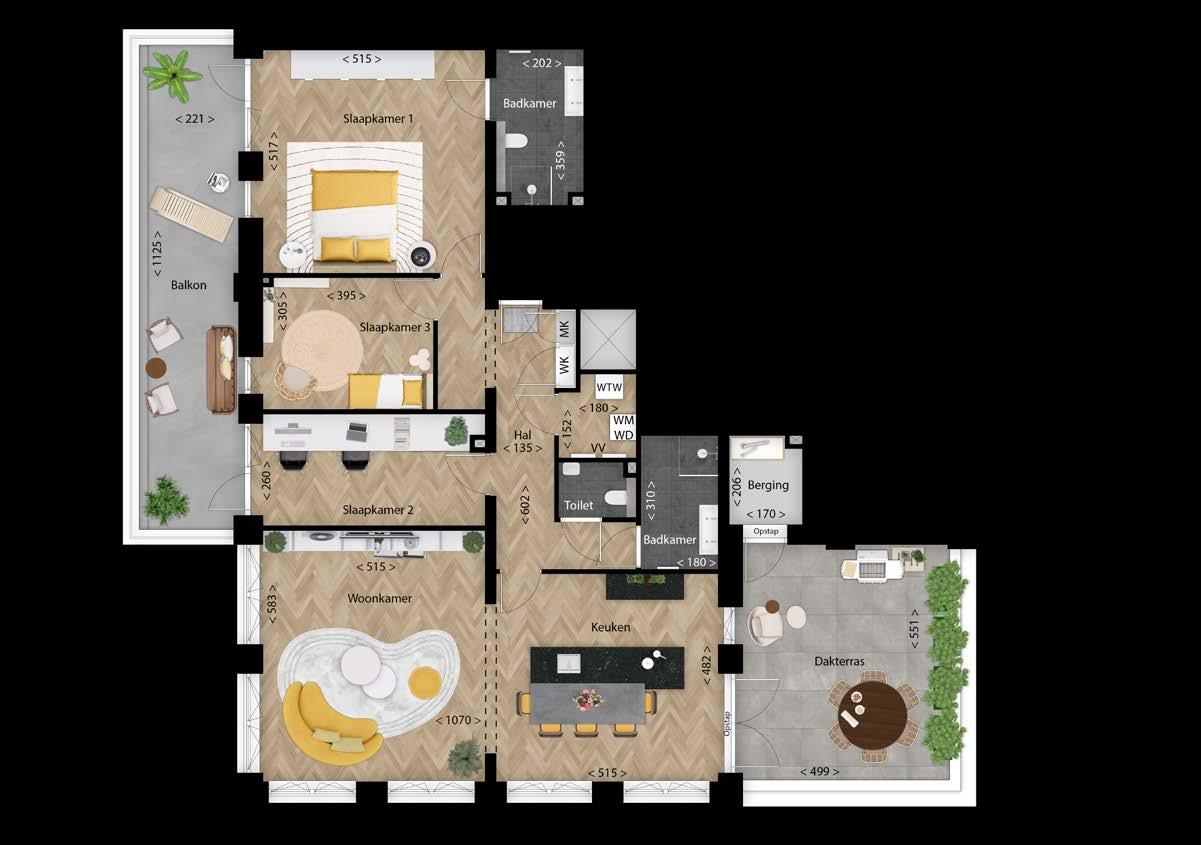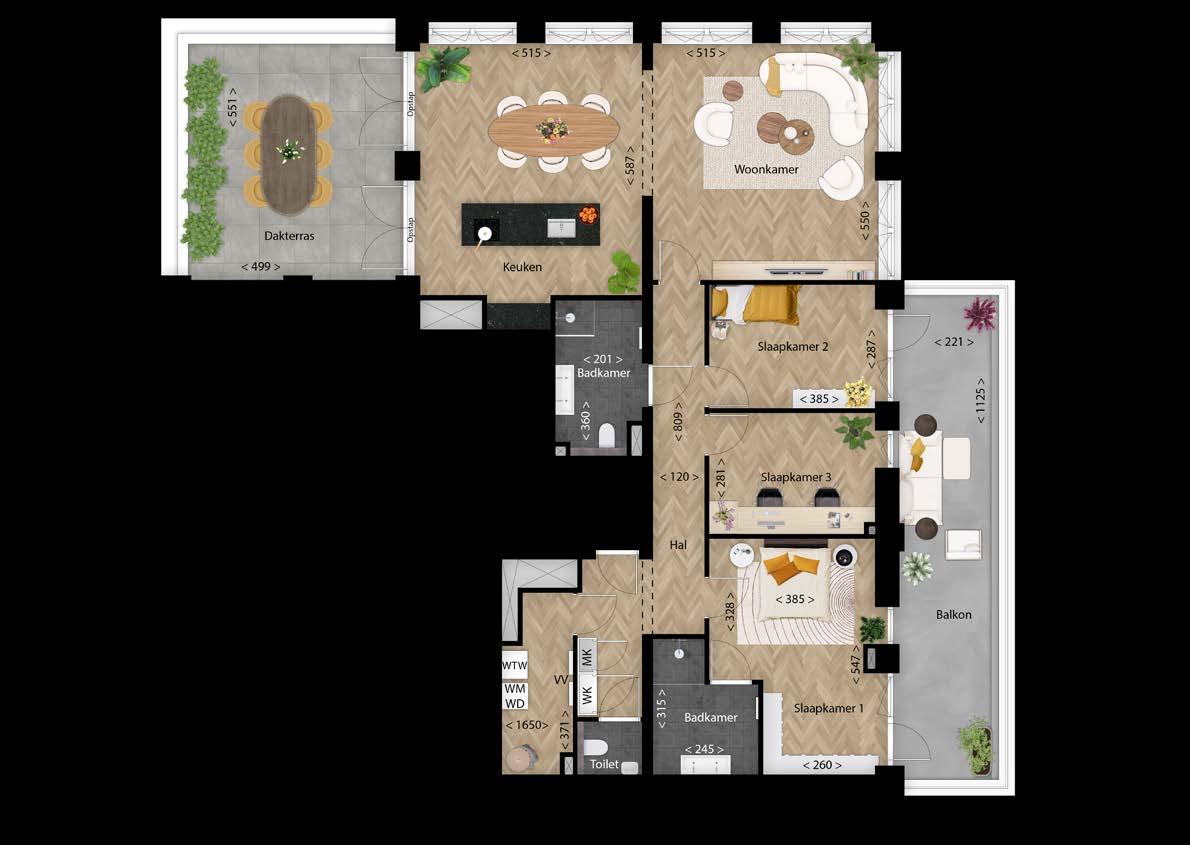 Als je van luxe houdt, dan is dit riante penthouse met ongeveer 170 m2 woonoppervlakte perfect. Het heeft een balkon én een dakterras. Daardoor geniet je niet alleen van een prachtig uitzicht, maar ook van zonlicht op elk moment van de dag. Eén van de slaapkamers is uitgerust met een ensuite badkamer voor extra privacy. Je kunt je spullen makkelijk kwijt in de inpandige berging of de berging bij jouw eigen parkeerplek in de stallingsgarage.
