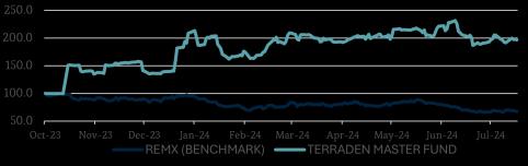 During the quarter, our portfolio generated a positive alpha of 16.5%. However, this relative gain came against the background of a consistently weak market and a benchmark (REMX) that lost 17.2%.