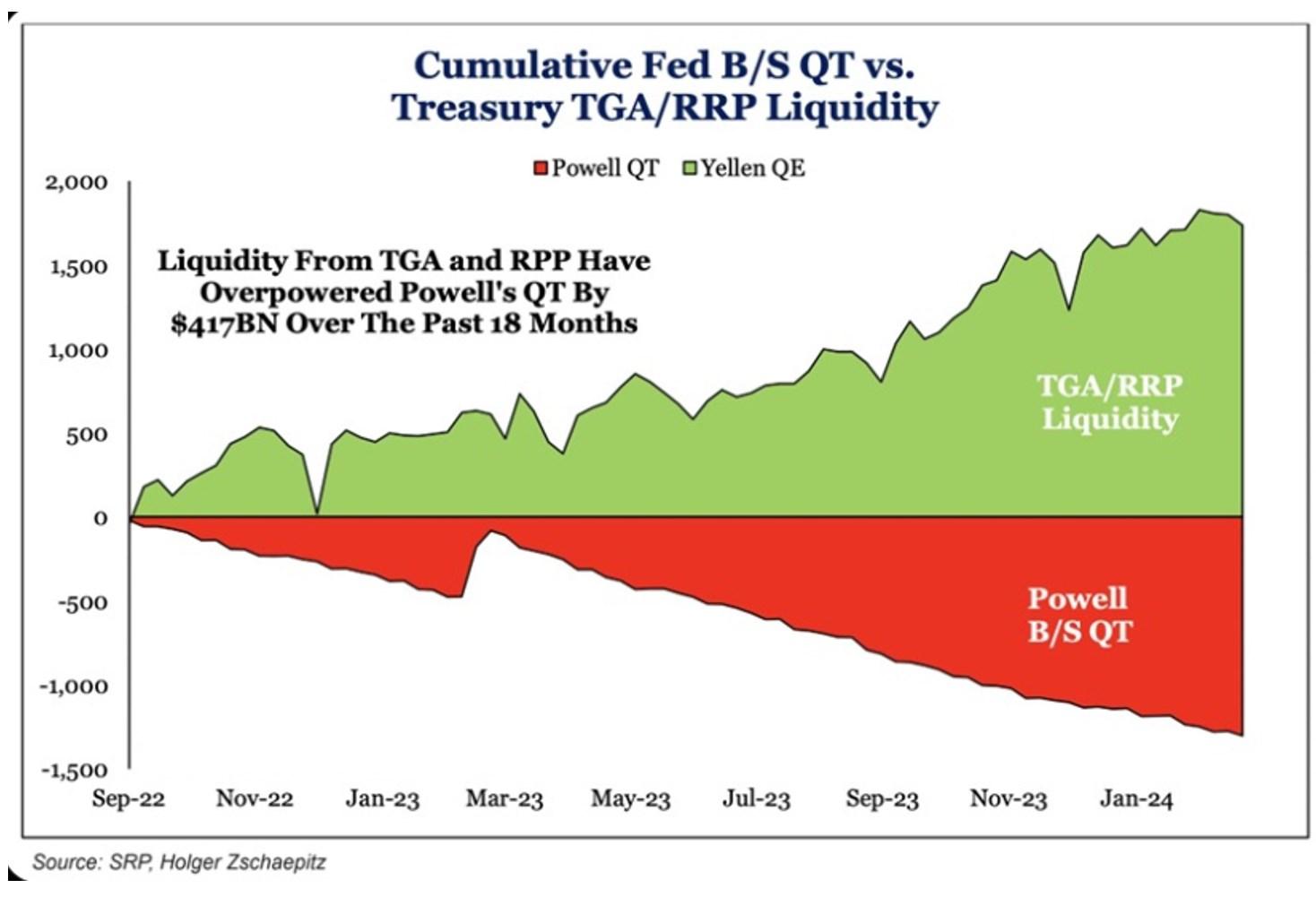 This execution gap illustrates a worrisome disconnect between the actual economic activity and the well-lubricated conditions in the financial markets, Fed or not Fed. The Treasury Department’s liquidity injections, engineered via reverse repos and the general account, have more than offset the Fed’s USD $95 billion per month QT, which effectively functions as a backdoor push against inflation.