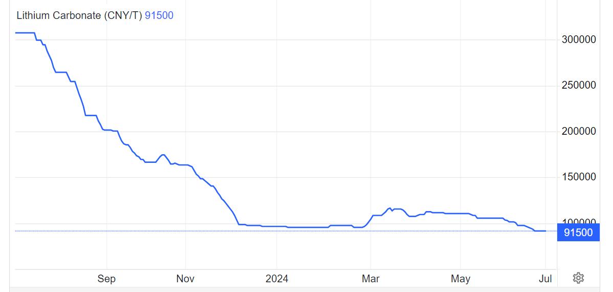 Slow market activity saw the price of lithium carbonate hover around USD $13,400/t in China. Chinese lithium hydroxide is not faring any better, reaching USD $12,300/t, down 14% from US$14,300/t The hydroxide to carbonate discount is emblematic for China’s increasing reliance on LFP batteries (lithium iron phosphate) that require carbonate feed. 6% spodumene concentrate, produced by miners, is priced below the USD $1,000/t.