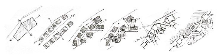 The first step of the process is the design of form families. The three categories include shared compounds (dormitories, lecture halls) individual spaces (galleries and meditation rooms) and features in landscape design (ponds, gardens and platforms). These object-like forms provide a repeatable palette of ingredients that can be further manipulated in both scale and placement.