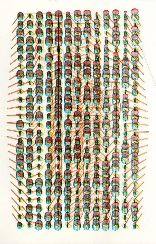 A system of connections and hierarchy is established through the generation of pen-plotted drawings. Reflecting a cyclical feedback loop of data, HPGL commands are sent to the pen-plotter to bring the otherwise digital information into an physical state. These drawings are then scanned and fed back into a Blender file as digital textures.