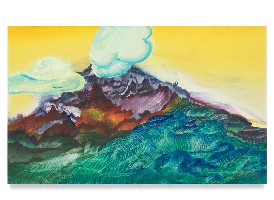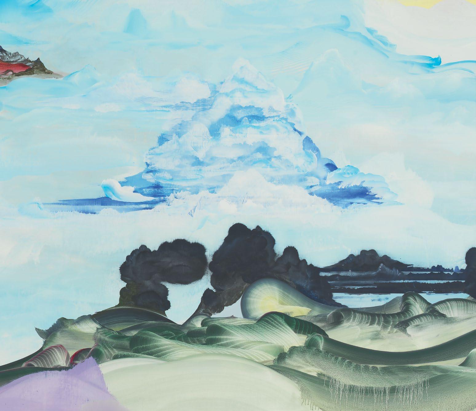Joan Mitchell’s chromatic expanses come to mind when I view Green’s paintings, and I wonder whether their two bodies of work—Mitchell’s and Green’s—occupy the same point on the spectrum between figuration and the nonobjective. Mitchell conquers unhappiness and ennui through lavish color and by severing color from the forms it usually composes; Green conquers abstraction by ignoring it and producing specific shapes that drift from the moorings of recognizable natural entities—the “cloud” and “mountain” that define a cosmology oriented toward the human. Green thus liberates “mountain” and “cloud” from their imprisonment within a Romantic vision governed by soulfulness and by a fear that interiority (the bounty of the imagination) will be evacuated by a sudden vanishing of inspiration.