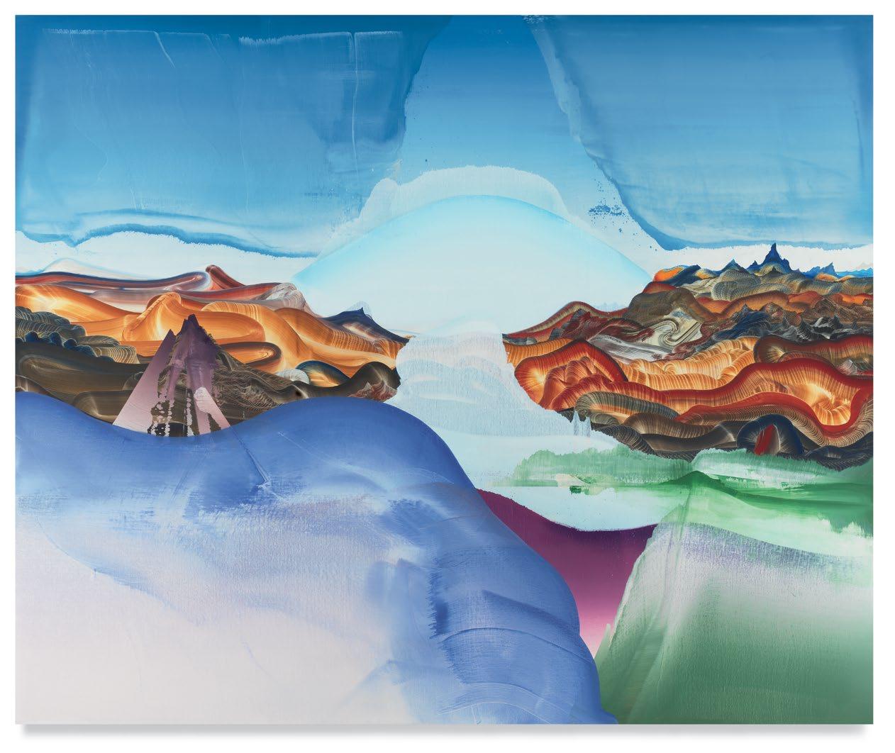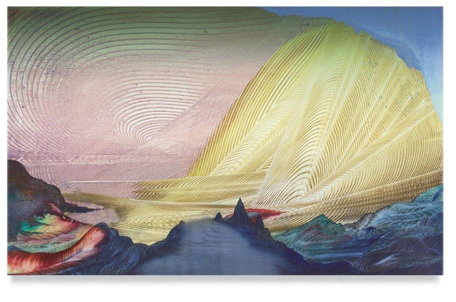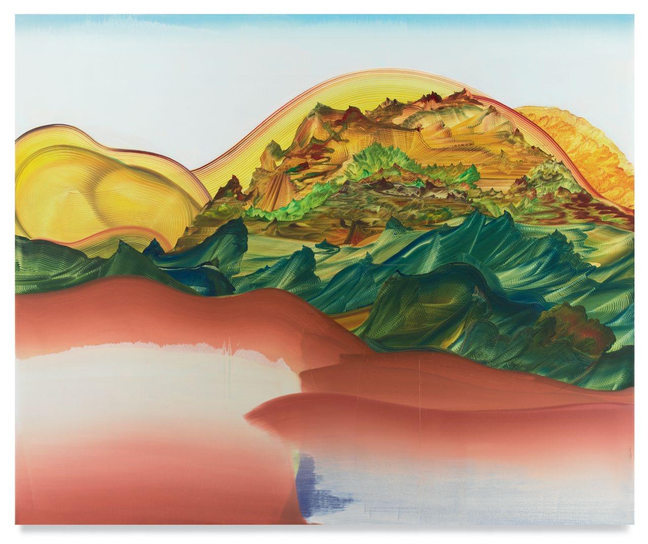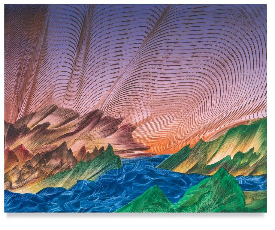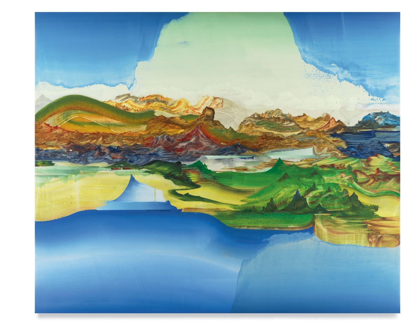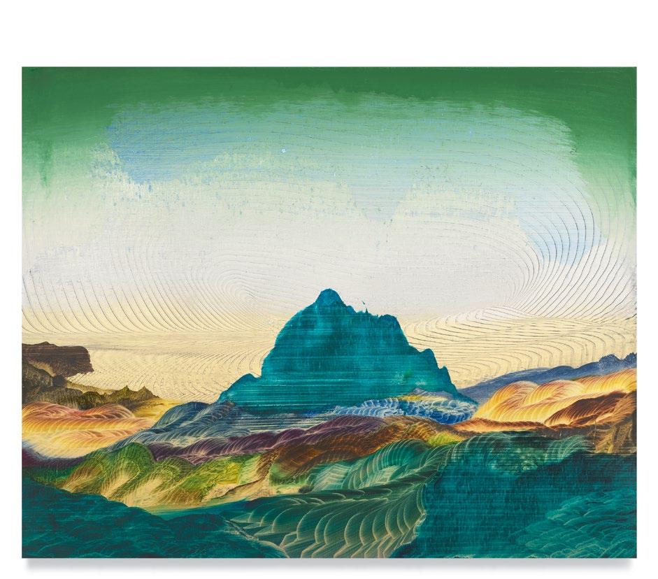 a quick and patterned back-and-forth between two speakers, each contributing a line at a time. As an antagonist on stage might offer a retort as a foil to the partner’s cry that came before, so, in Green’s studio, one “event”—one layer of paint, one rhythmic application of a home-crafted squeegee or sponge—follows another, in response to the preceding gesture. A certain quality of accident, even of whimsy, determines a painting’s tempo of unfolding, though the finished result approaches the condition of photography. Indeed, when I see images of Green’s paintings, perhaps as “thumbnails” on a gallery website, I sometimes mistake them for specimens of nature photography—close-ups, magnified, of a gem’s strata, a pond seen in cross-section, or a mountain’s veined interior.