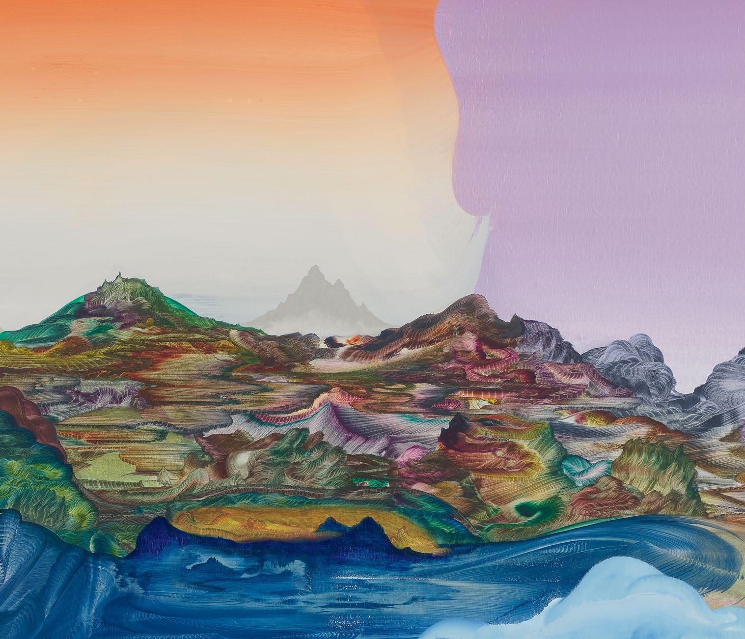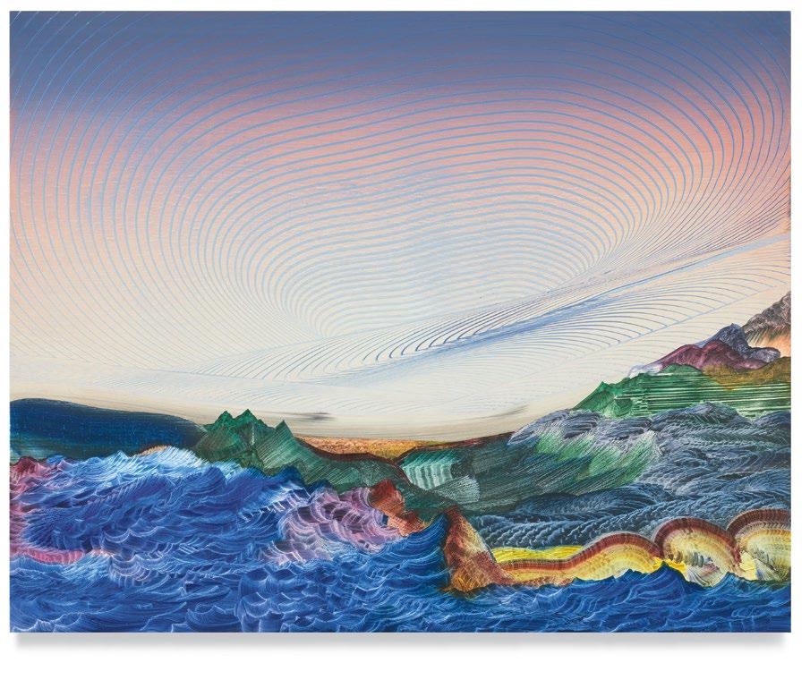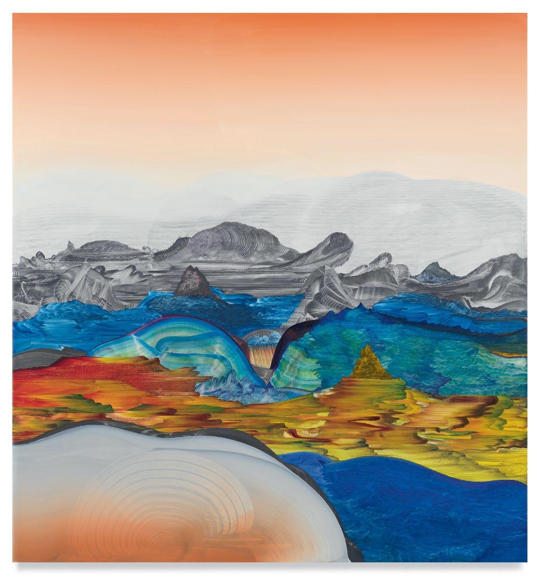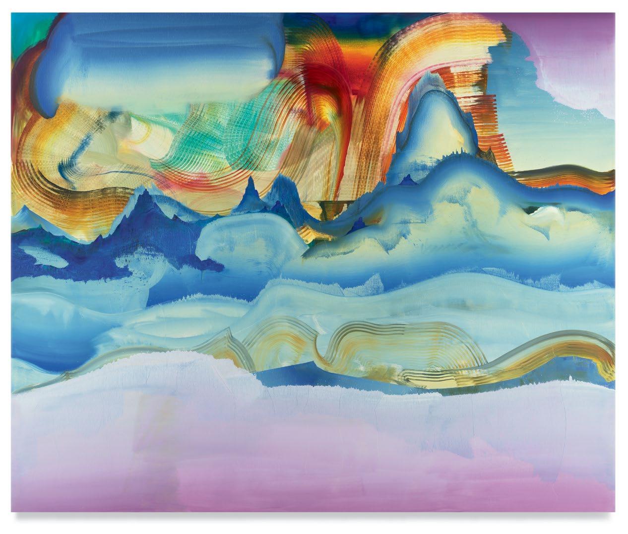 a quick and patterned back-and-forth between two speakers, each contributing a line at a time. As an antagonist on stage might offer a retort as a foil to the partner’s cry that came before, so, in Green’s studio, one “event”—one layer of paint, one rhythmic application of a home-crafted squeegee or sponge—follows another, in response to the preceding gesture. A certain quality of accident, even of whimsy, determines a painting’s tempo of unfolding, though the finished result approaches the condition of photography. Indeed, when I see images of Green’s paintings, perhaps as “thumbnails” on a gallery website, I sometimes mistake them for specimens of nature photography—close-ups, magnified, of a gem’s strata, a pond seen in cross-section, or a mountain’s veined interior.