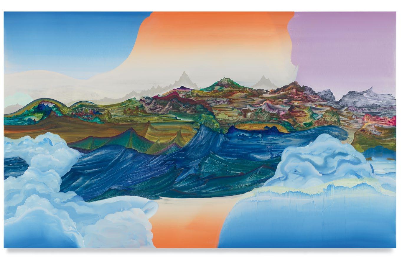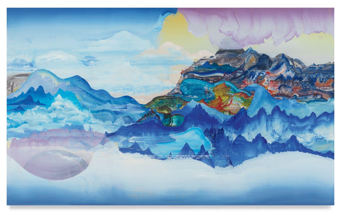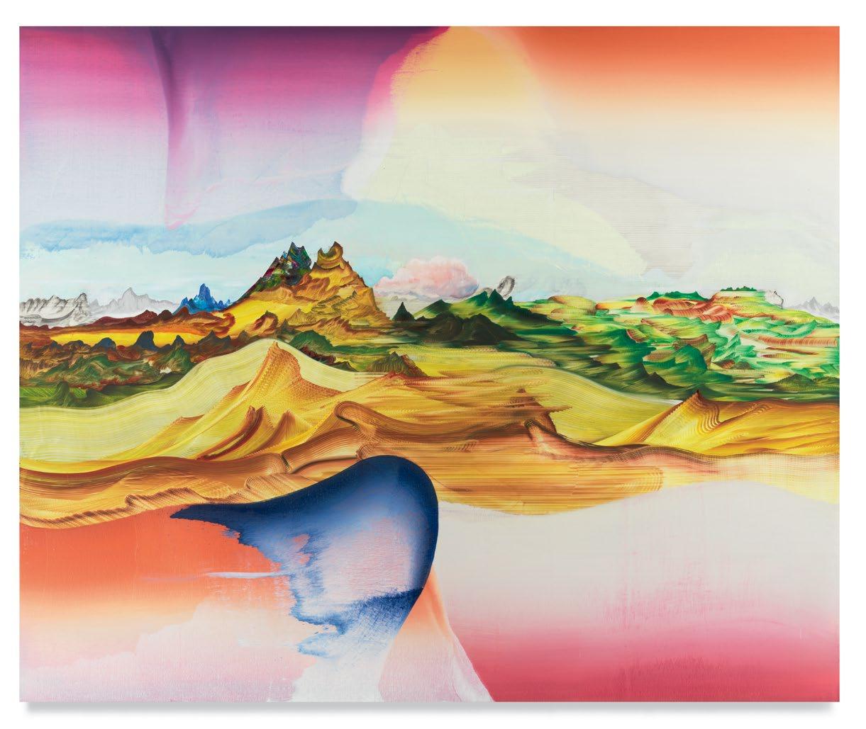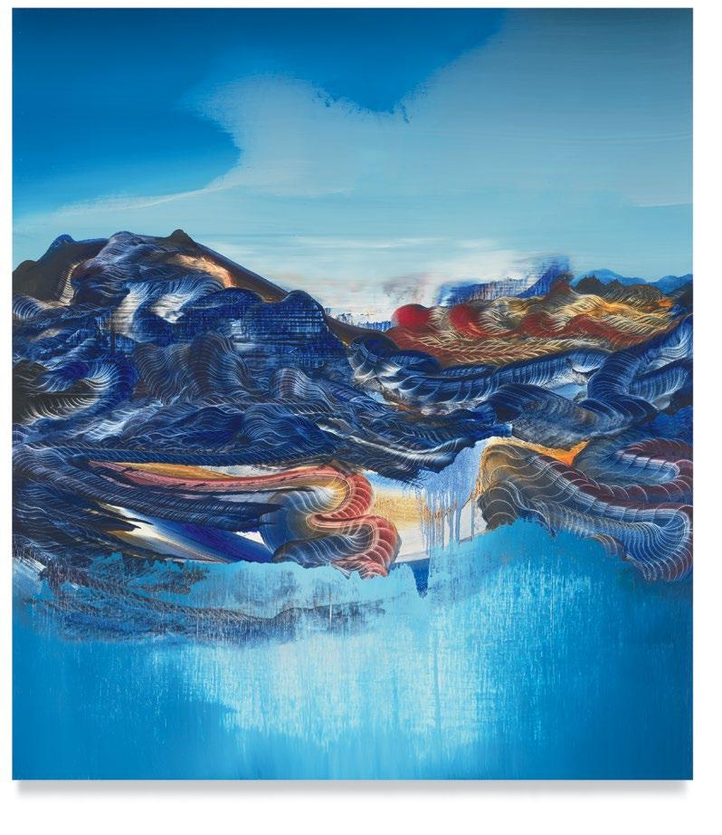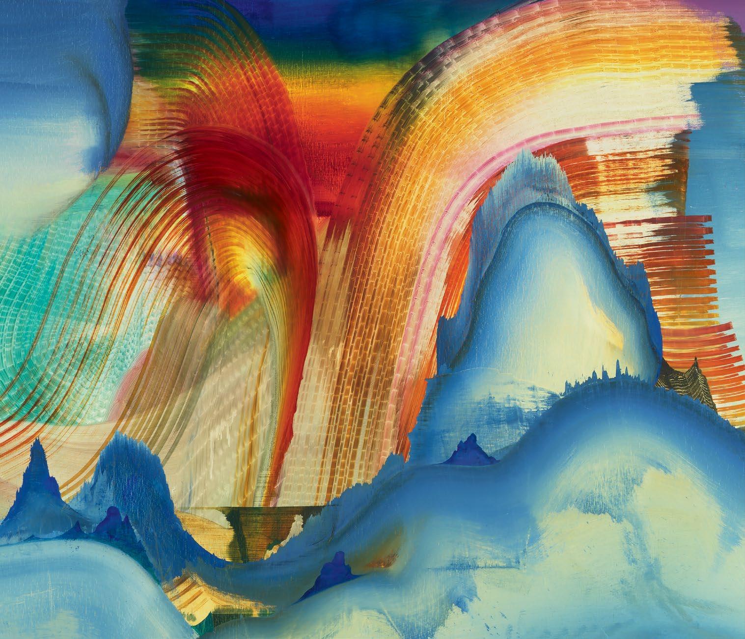a quick and patterned back-and-forth between two speakers, each contributing a line at a time. As an antagonist on stage might offer a retort as a foil to the partner’s cry that came before, so, in Green’s studio, one “event”—one layer of paint, one rhythmic application of a home-crafted squeegee or sponge—follows another, in response to the preceding gesture. A certain quality of accident, even of whimsy, determines a painting’s tempo of unfolding, though the finished result approaches the condition of photography. Indeed, when I see images of Green’s paintings, perhaps as “thumbnails” on a gallery website, I sometimes mistake them for specimens of nature photography—close-ups, magnified, of a gem’s strata, a pond seen in cross-section, or a mountain’s veined interior.