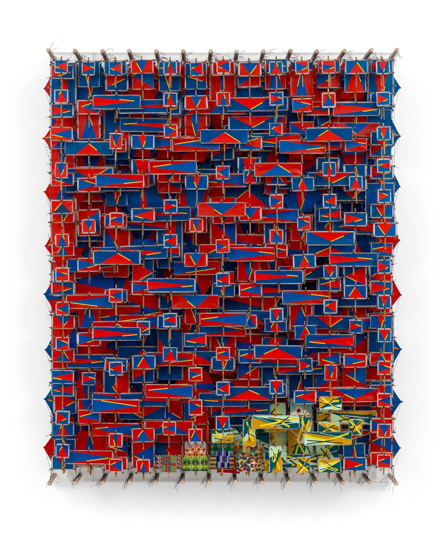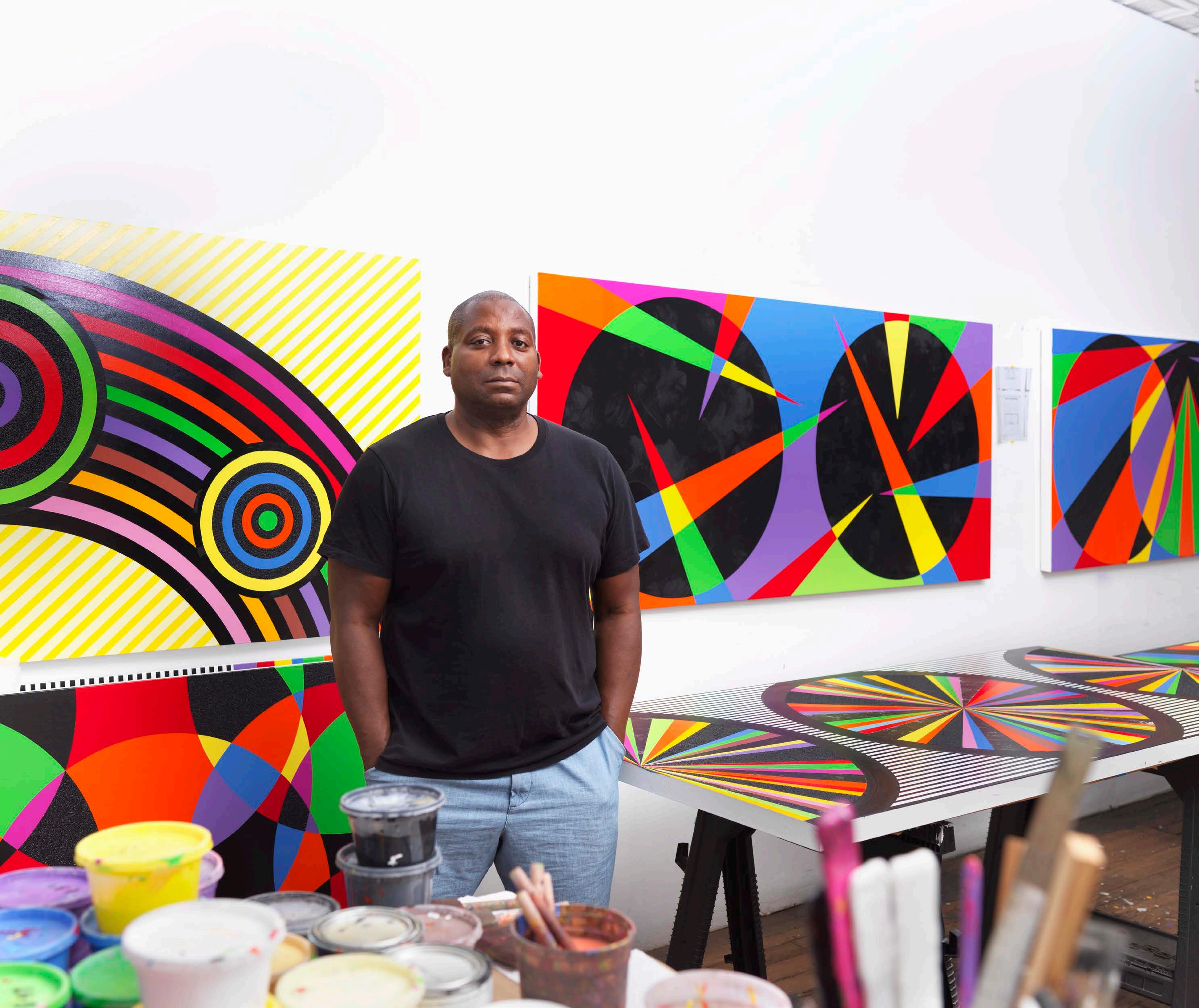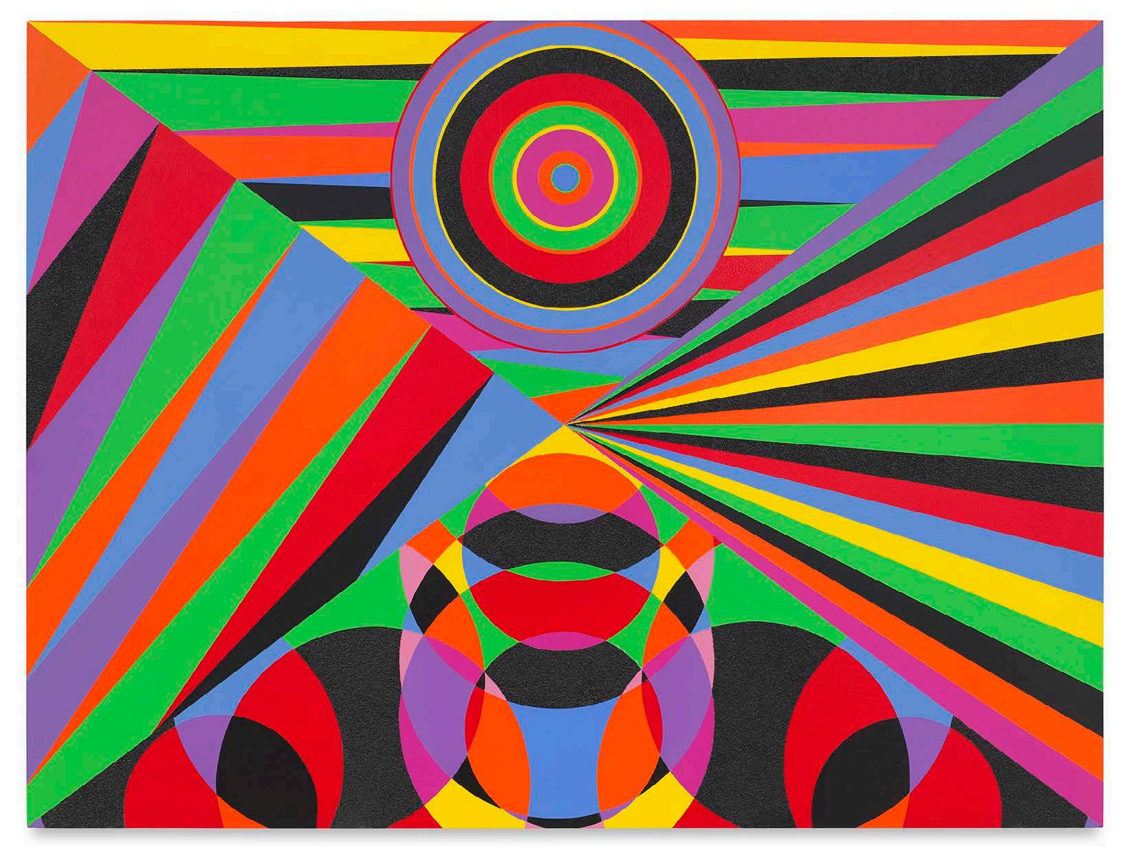 “There is a palpable centrifugal force in Rico Gatson’s work. These colorful, hard-edge compositions of stripes, circular forms, triangles, and other geometric shapes generate a pulsating energy generally emanating from the center. They are painted with acrylic on hollow-core wood doors, suggestive of portals to some other spatial and spiritual realm... These compositions appear more static and emblematic, in the manner of a flag or a political banner.