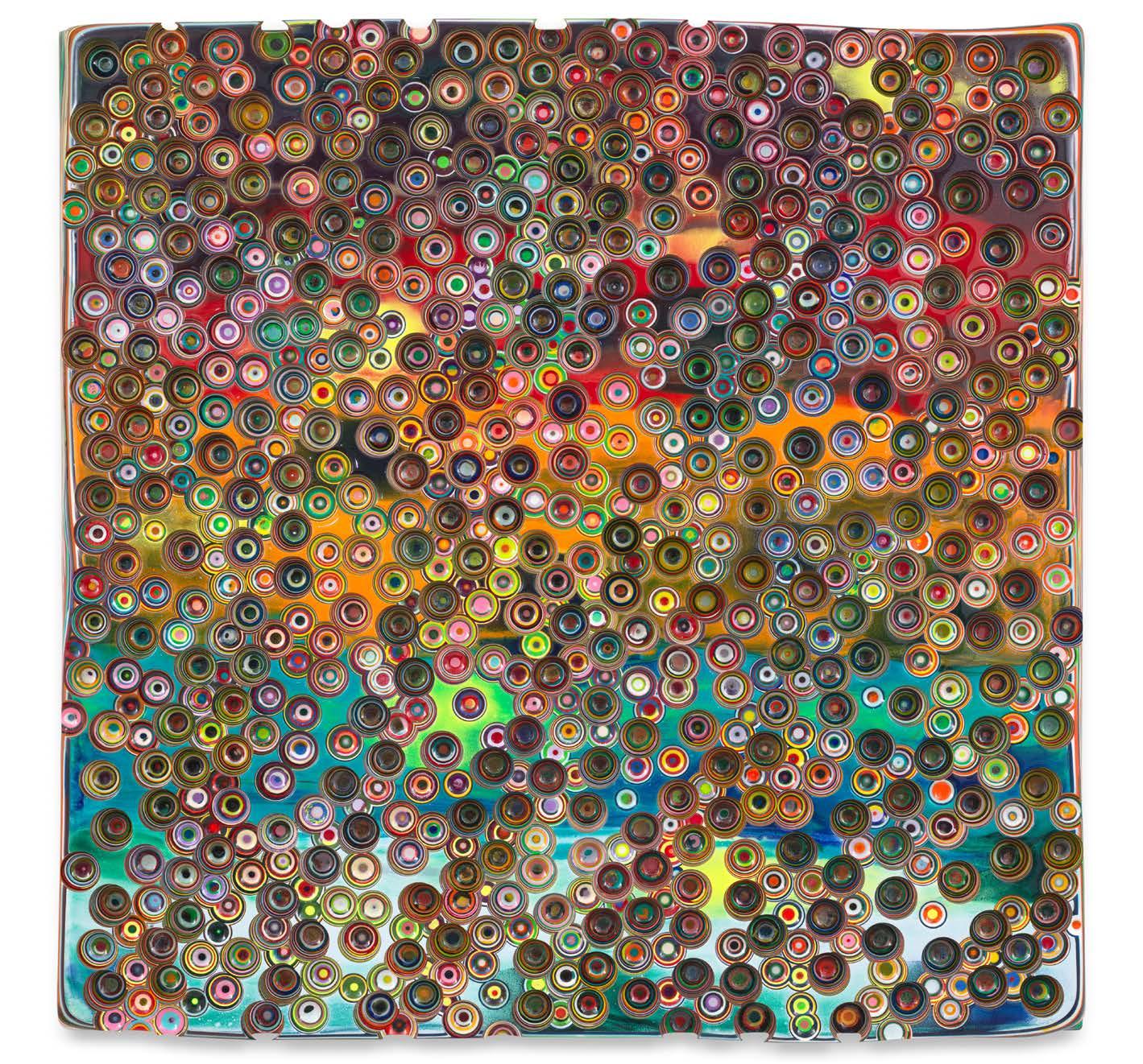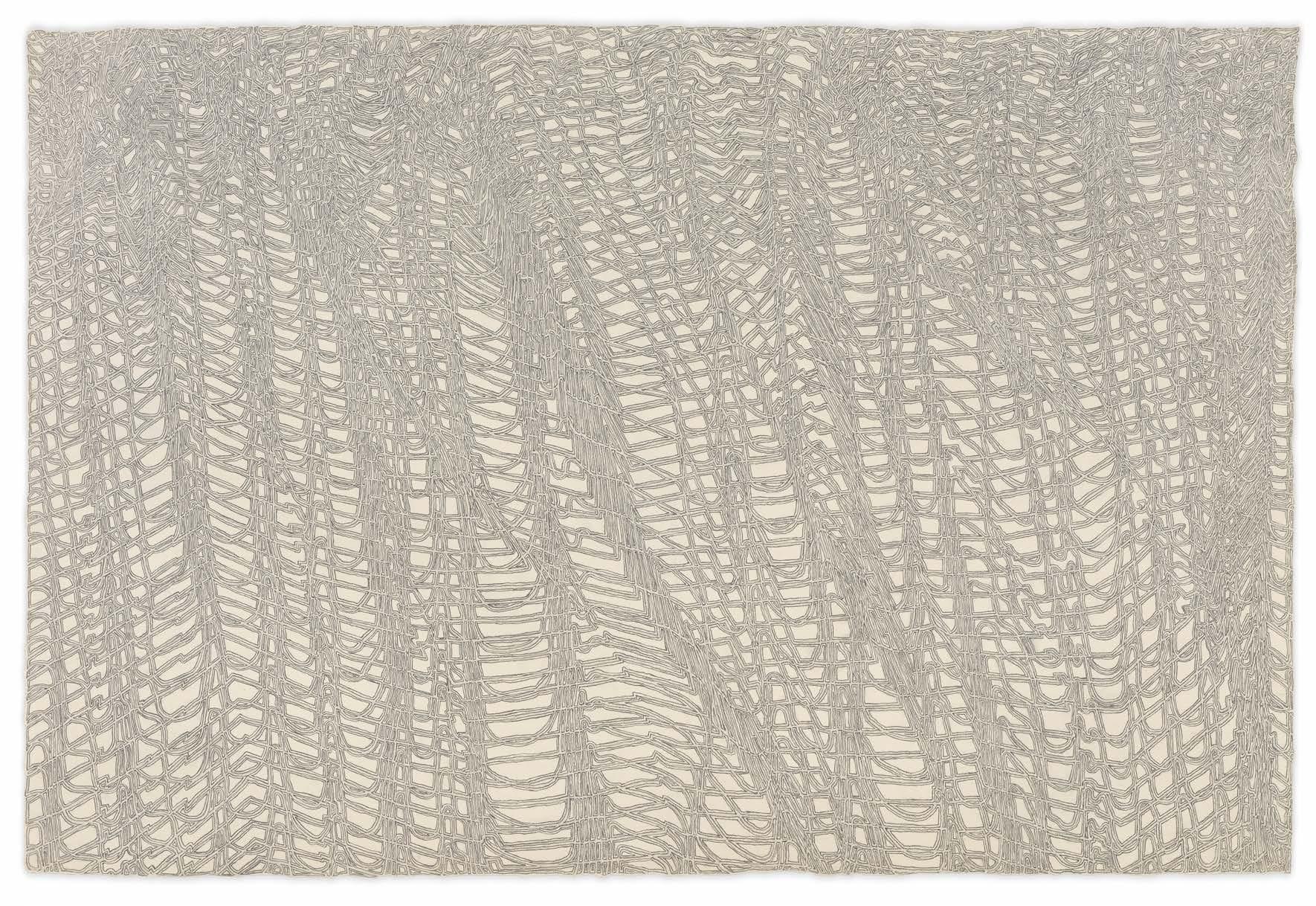 “Executing premeditated compositional directives freehand and using the slick combination of sign painter’s enamel on aluminum, Siena creates jiving geometric patterns whose careful craftsmanship marks them with durational depth and attractive immediacy. While the underlying structures of his compositions afford them a measured integrity, the unruliness of the lines’ behavior makes them come alive.”
