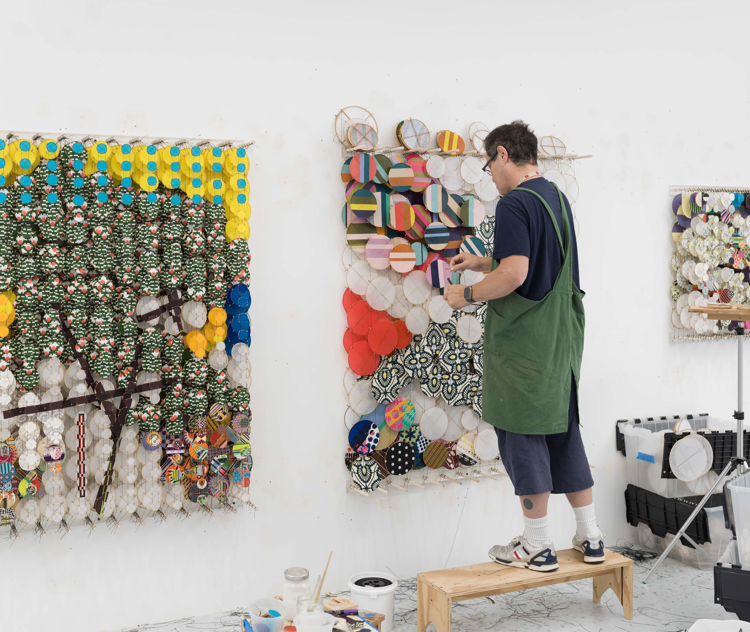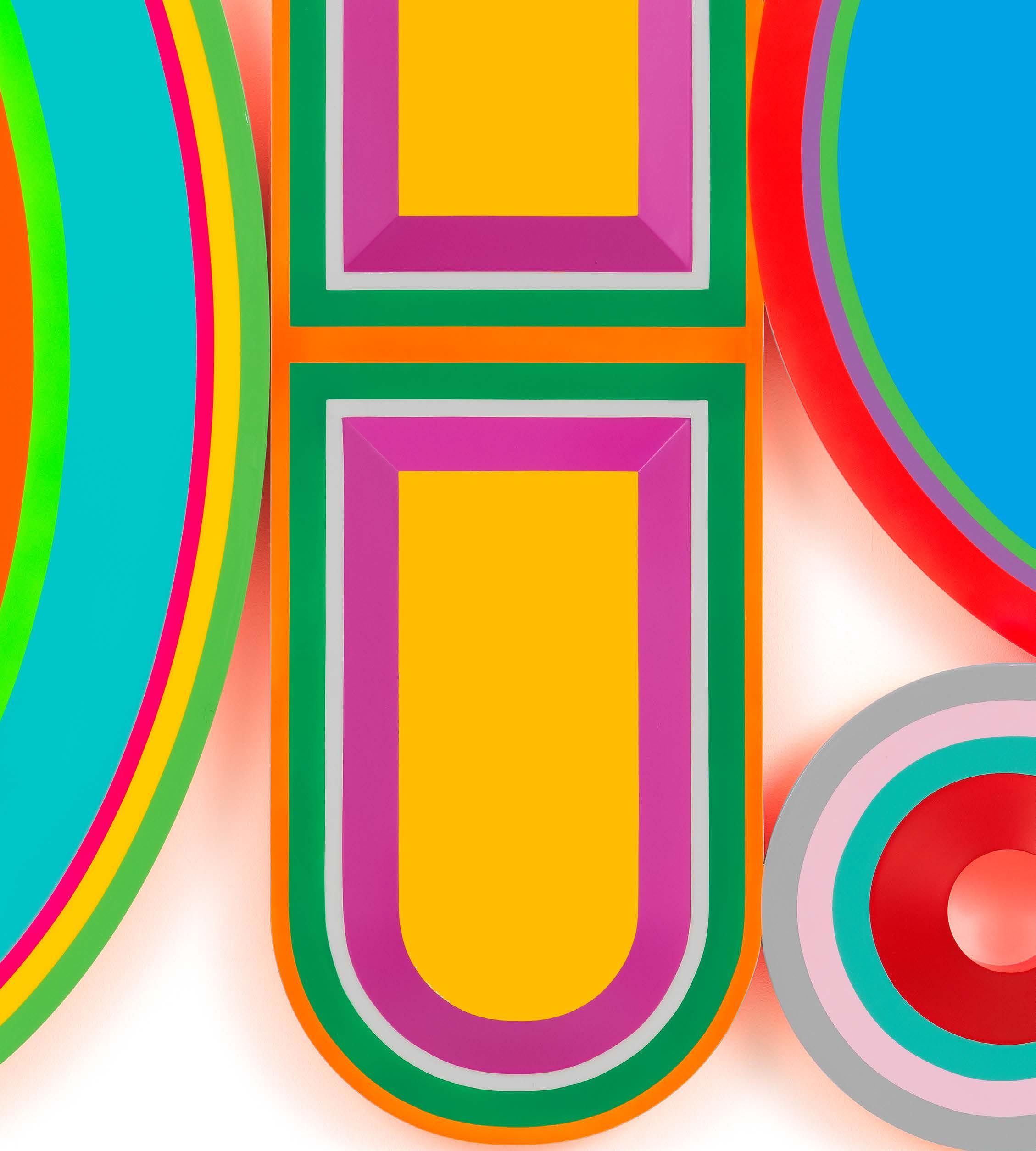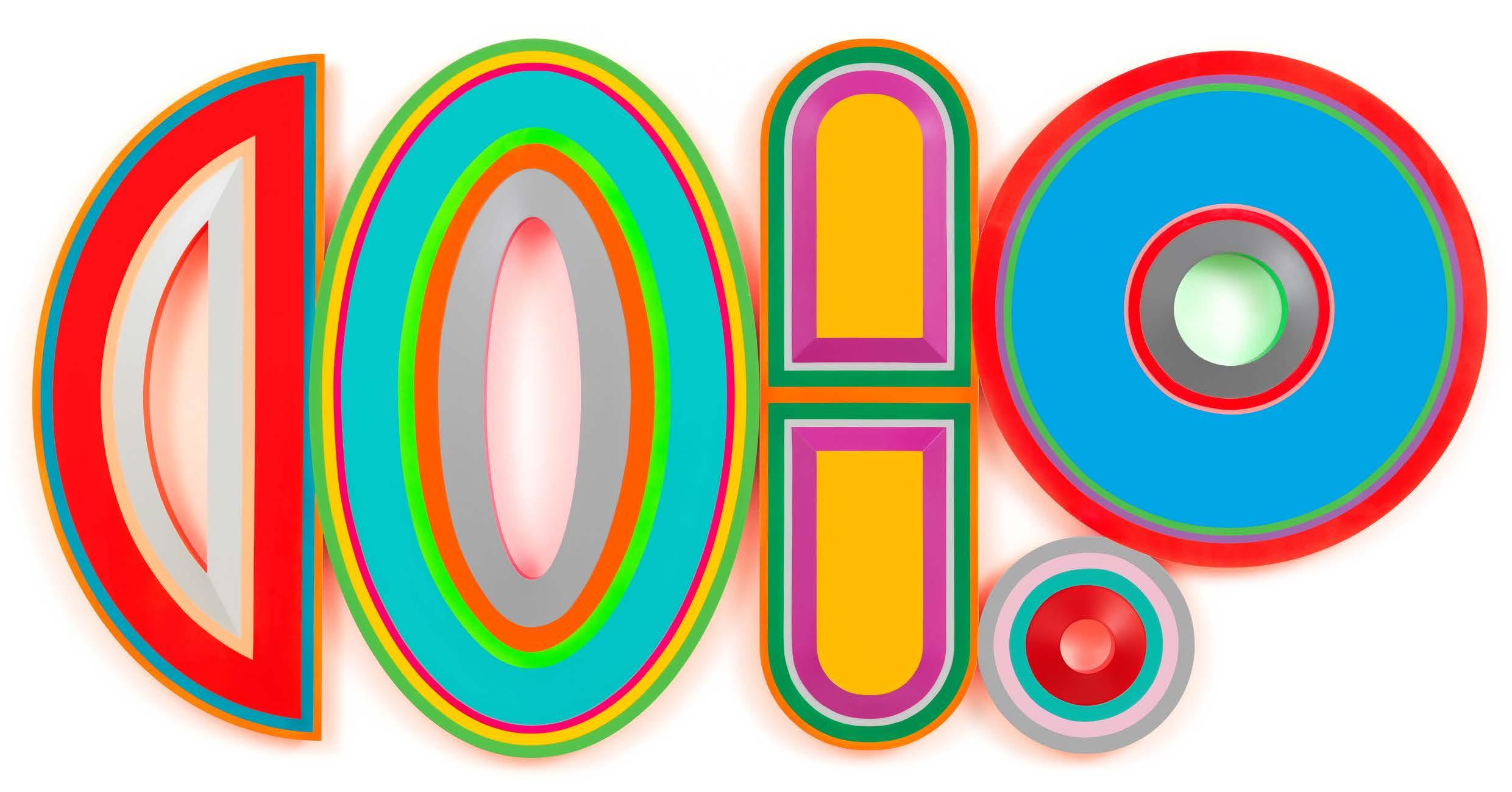“Beverly Fishman has been thinking about the cure for what ails us for the last 40 years. Her candy-colored constructions exist somewhere between painting, sculpture and bad trip: uppers and downers pulsating in happy, fluorescent hues—a medicine cabinet stocked with remedies for being human... continuing her series of faceted, urethane-shellacked wood forms that protrude from the wall, are a workaround to figuration—about the body but never depicting it, geometric abstraction as a feint to talk about contemporary culture, and what we ingest to cope with it.”